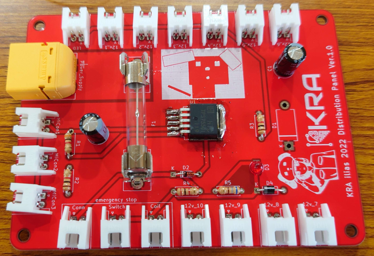 分電盤はLipoバッテリーの6セル(22.2V)から3.3 V、12 Vを供給し、スイッチで緊急非常停止が可能となる設計にしました。実際の写真が以下の通りです。