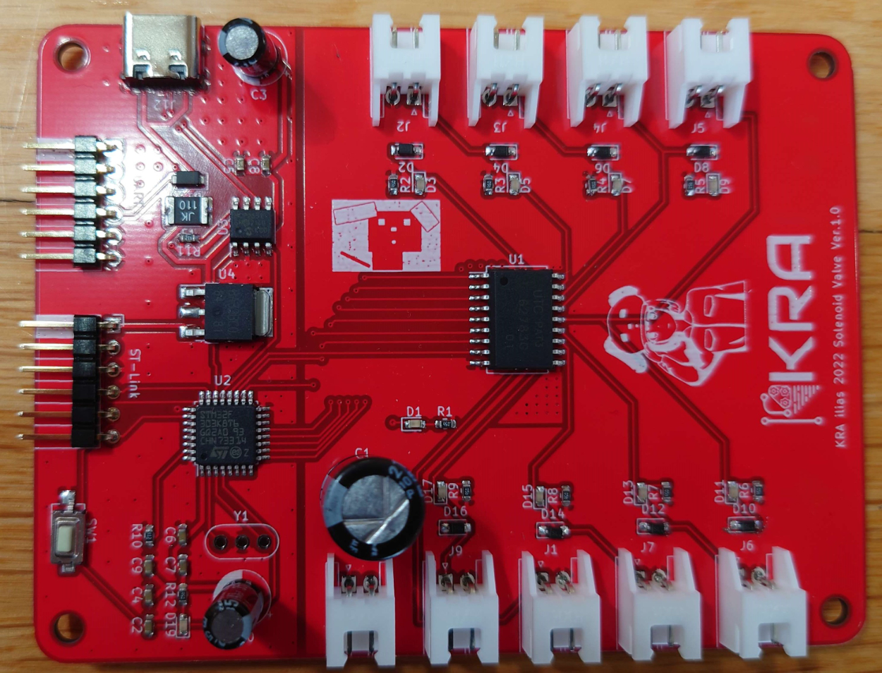 電磁弁制御基板はCAN通信とUART通信を実装し、別のマイコンから受けたコマンドにしたがって基板に接続した電磁弁を制御する設計です。