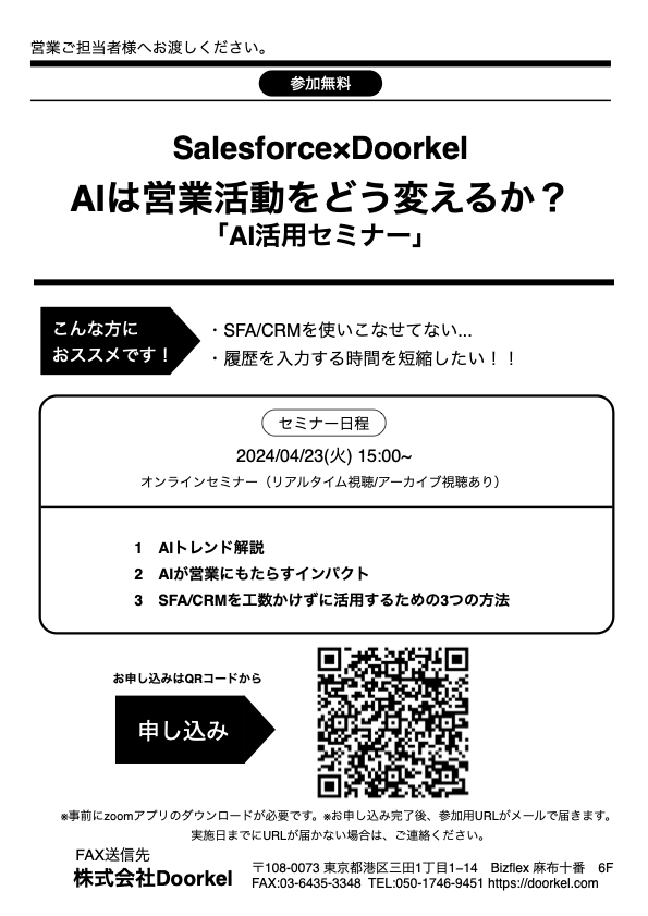 【実案件】株式会社Doorkel様(Salesforceウェビナー)FAX制作 Nabi(나비) WEBデザイナー・SNSマーケター・プランナー OVERVIEW 【NetFax】2024/4 企画・FAXデザイン・集客 YEAR 2024