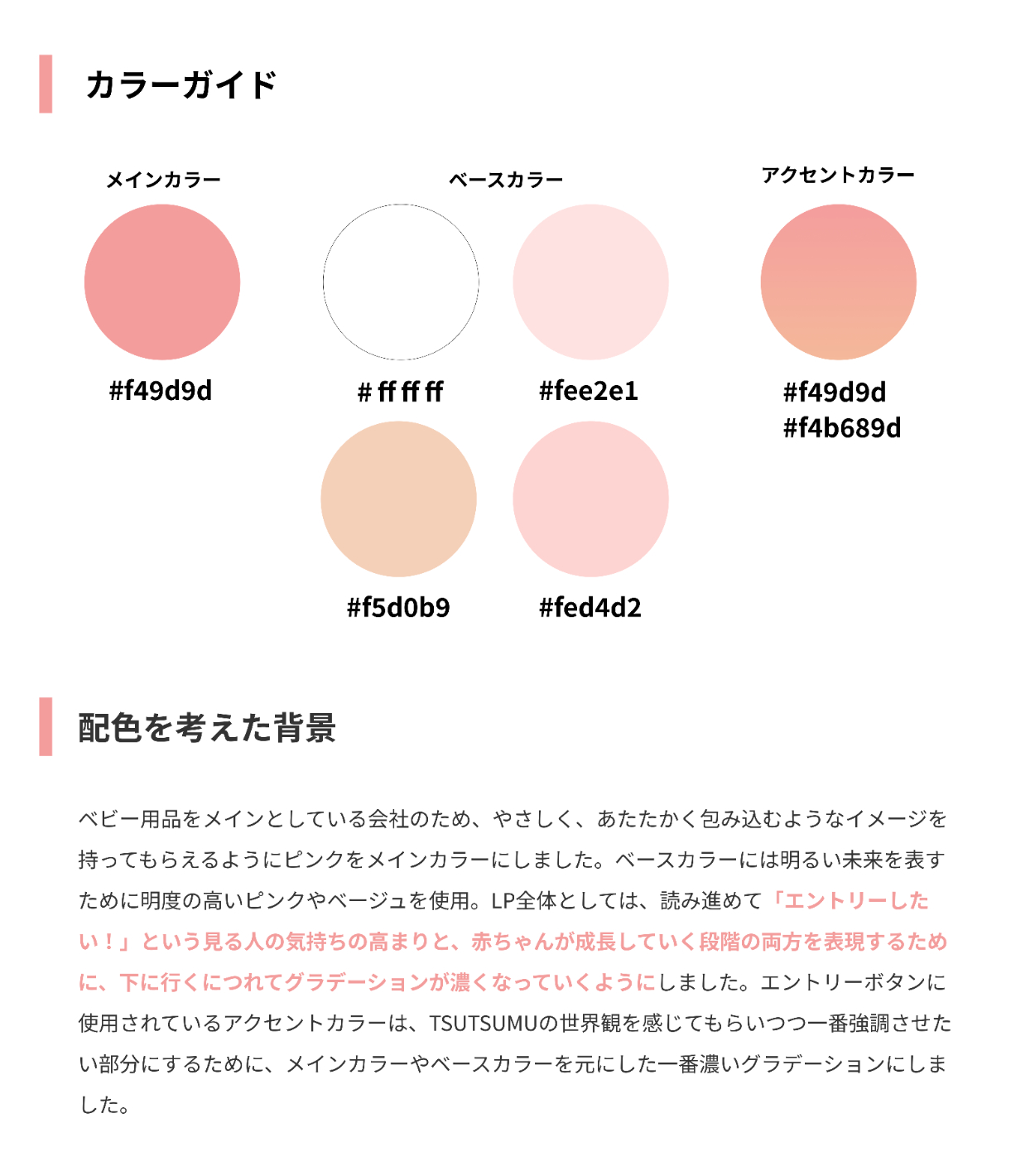 エントリーに向けた行動をとってもらえるよう、最初にユーザーストーリーをしっかり考えてからデザインしていくことが重要だと学びました。今回初めてデザインから実装まで取り組みましたが、コーディングについては最初にマークアップ設計図を作る大切さを実感しました。デザインカンプを作る際も、ただビジュアルを考えるのではなく、この見た目にするにはどうコードを書いていけばよいのかをある程度考えながらデザインすることでスムーズなコーディング作業ができることを学びました。