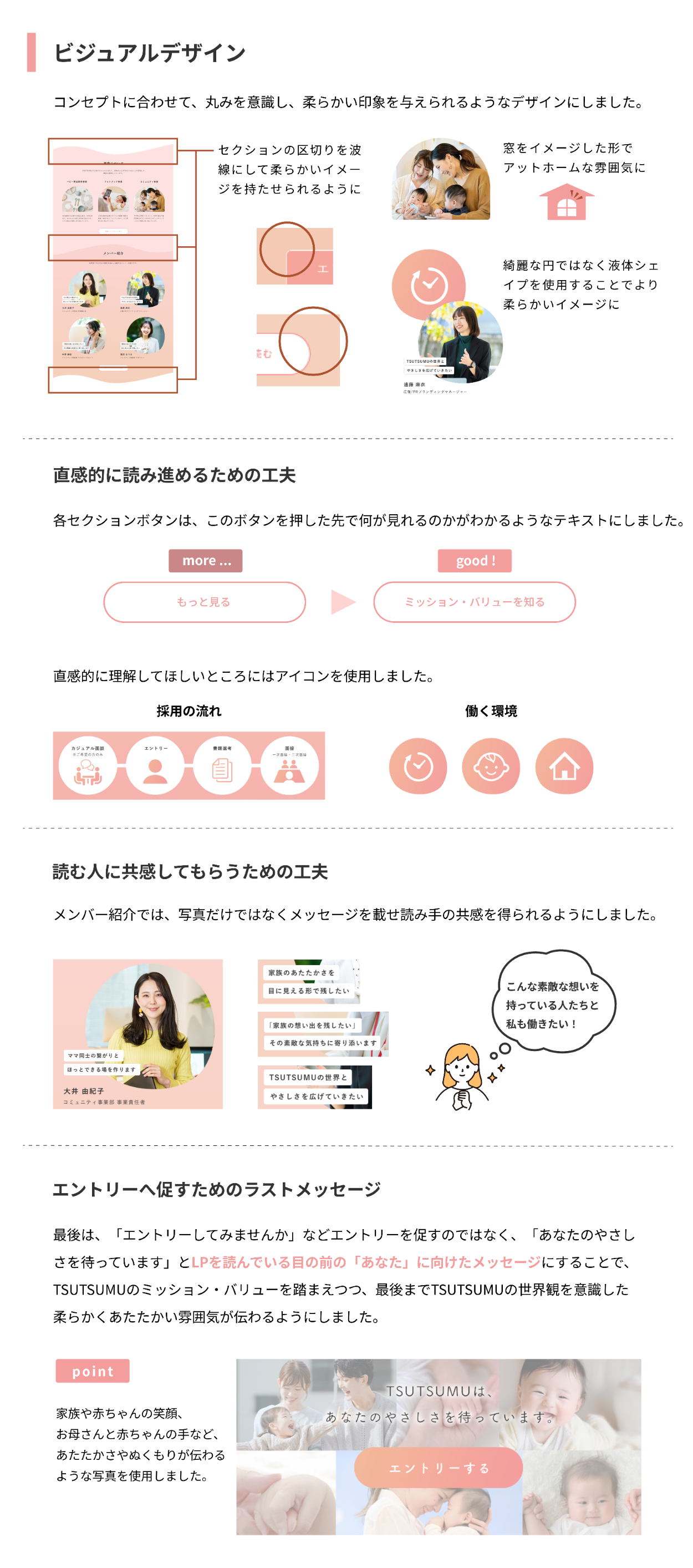 柔らかい雰囲気になるよう、jQueryを使用して、読み進めるとそれぞれの要素がふわっと表示されるようにしました。ボタンもふわっと大きくなるような動きにしました。