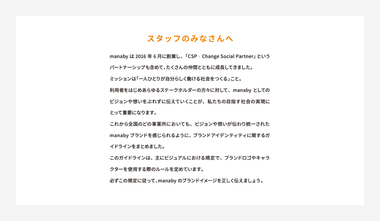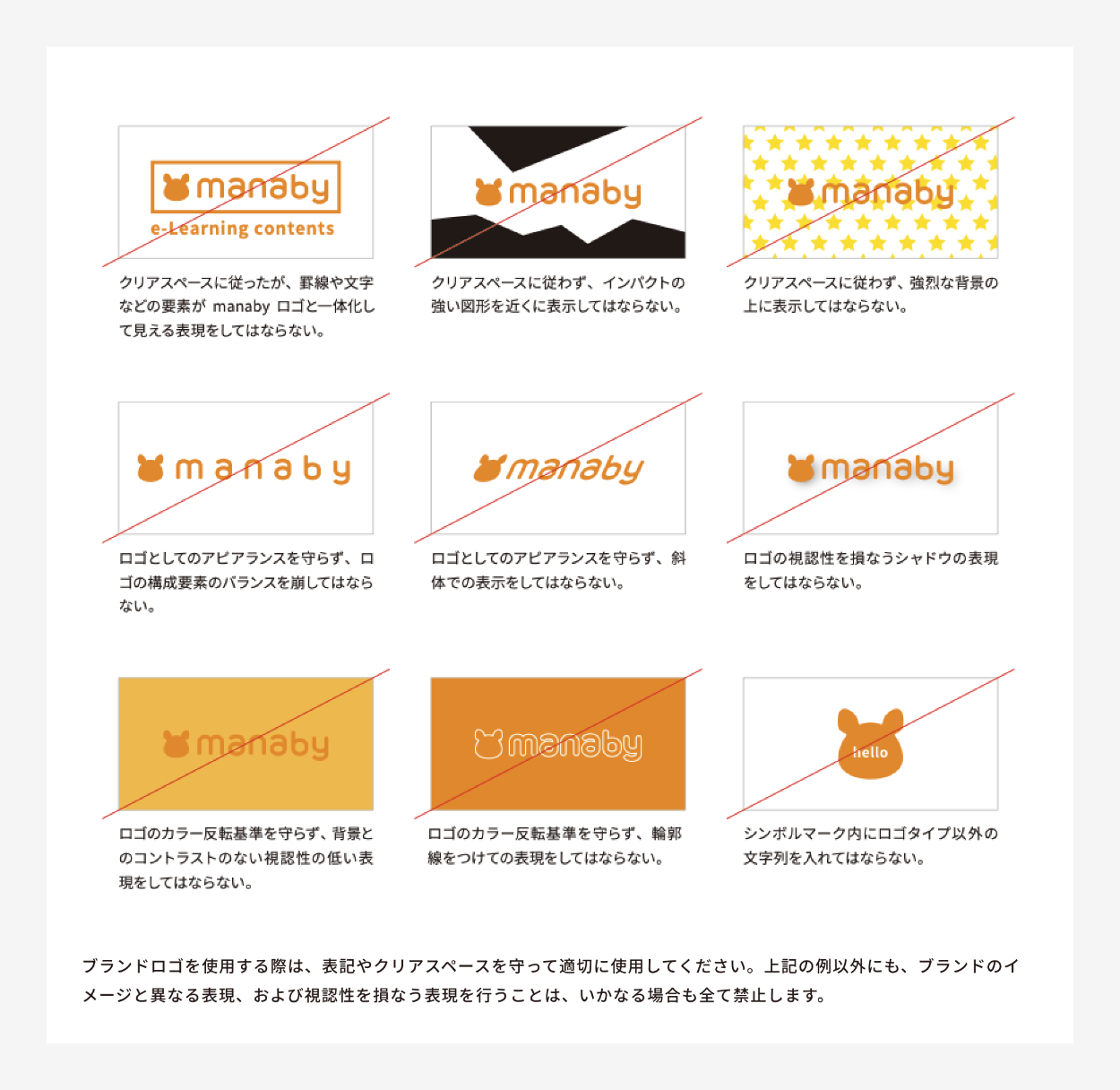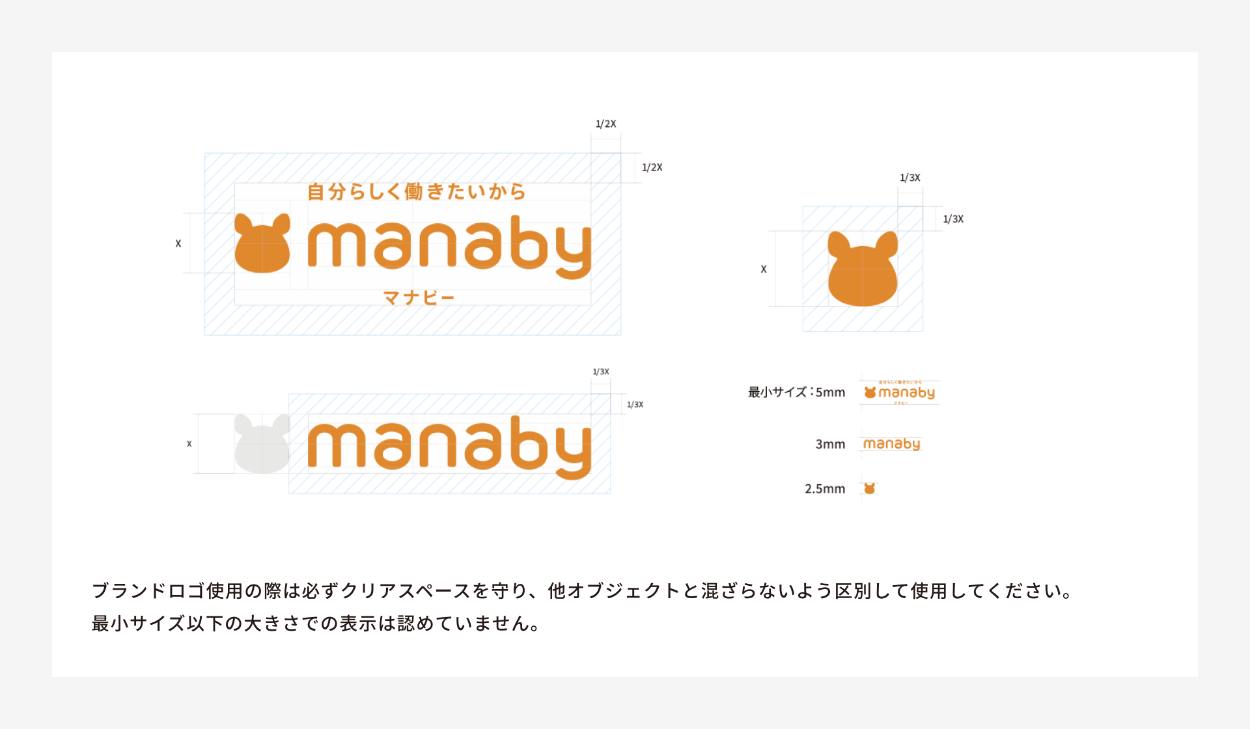 専任のクリエイティブチームやチェック担当者がいないため、それまでロゴやキャラクターは各事業所スタッフの裁量で自由に使用されていました。事業所数を拡大していく中でも、事業所での制作の自由を維持することは必要です。しかし同時にmanabyのイメージをぶらさないことも重要です。