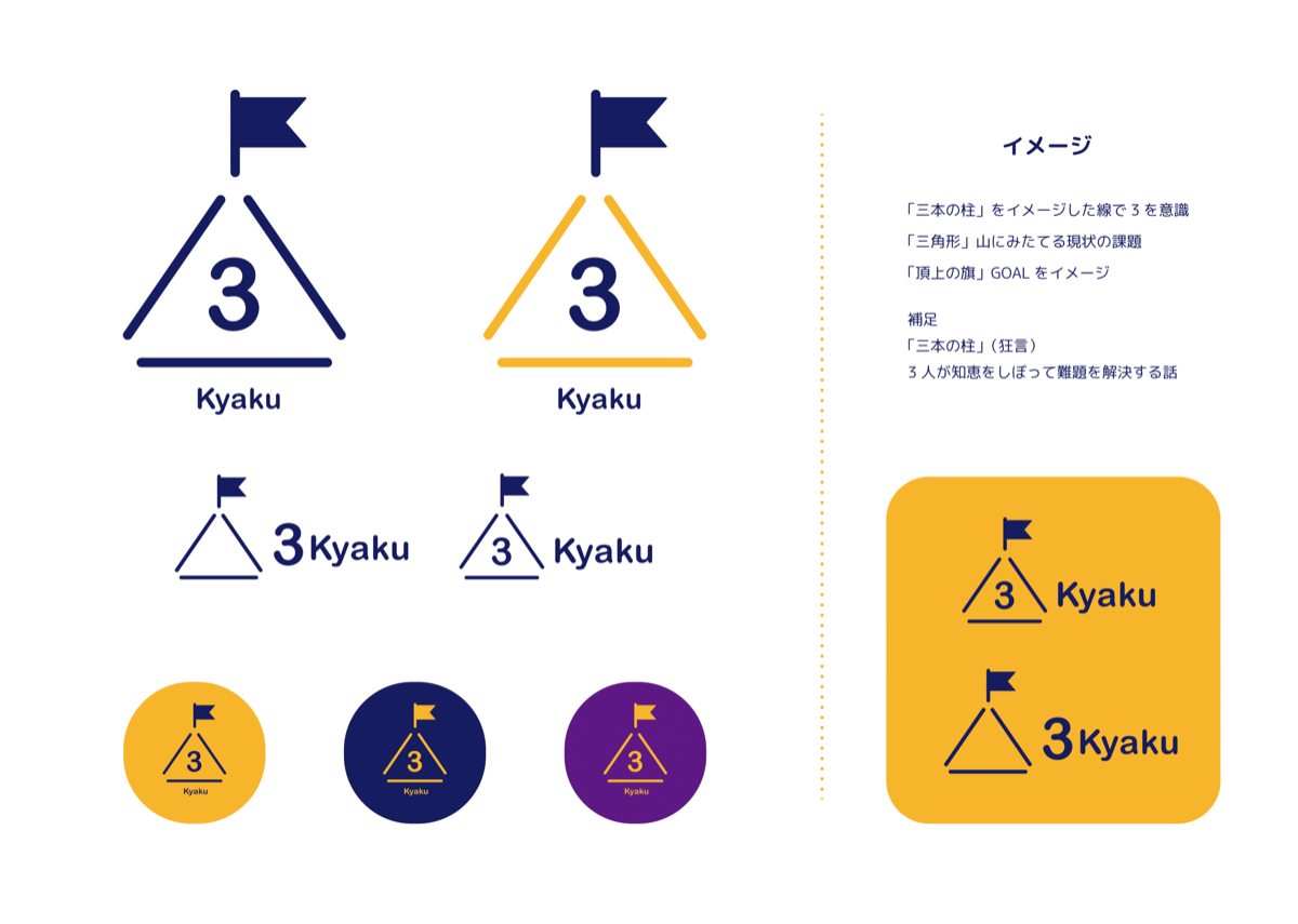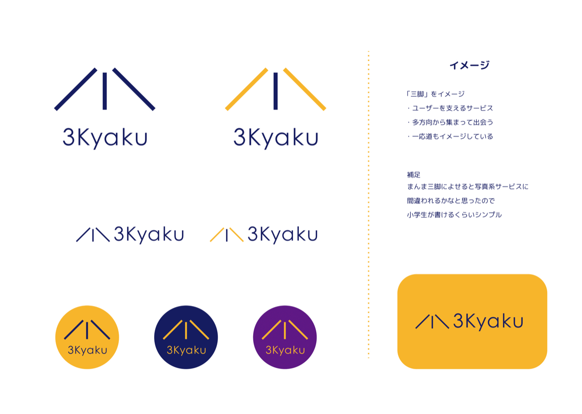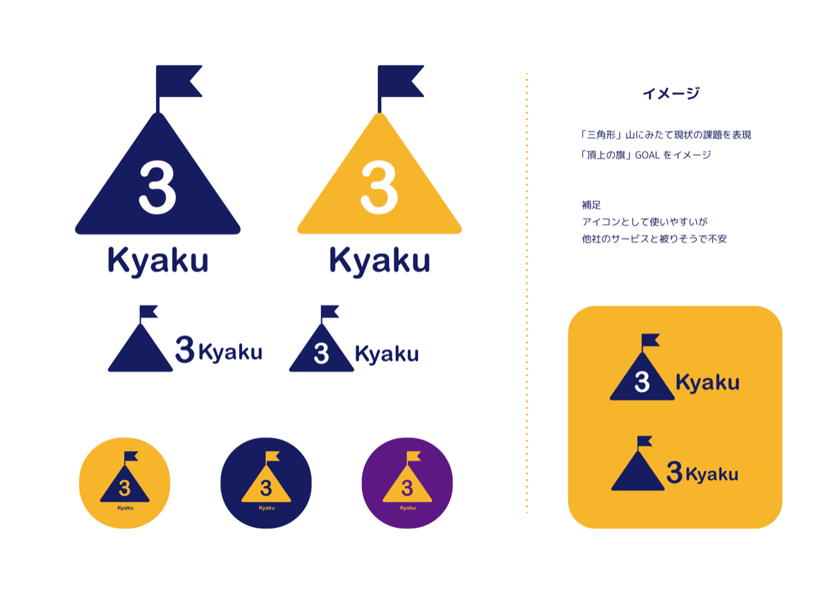 上の初期構想をメンバーに見てもらい意見をもらったうえで、カタチを絞り込んで提案を出しました。外部監修の方と、フロントエンジニアを兼ねる内部ディレクター、私の3人で話し合いをした結果。"ゴールテープに向かって道を走っている"イメージで作成したシンボルマークが3kyakuのコンセプトとマッチし、支える台にも見えるという事で、下記画像4つめの案でいくことになりました。