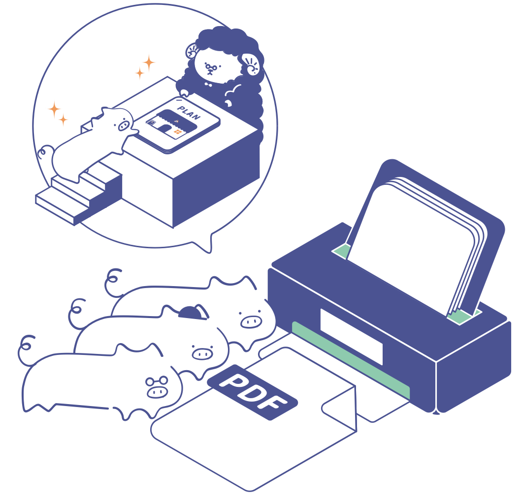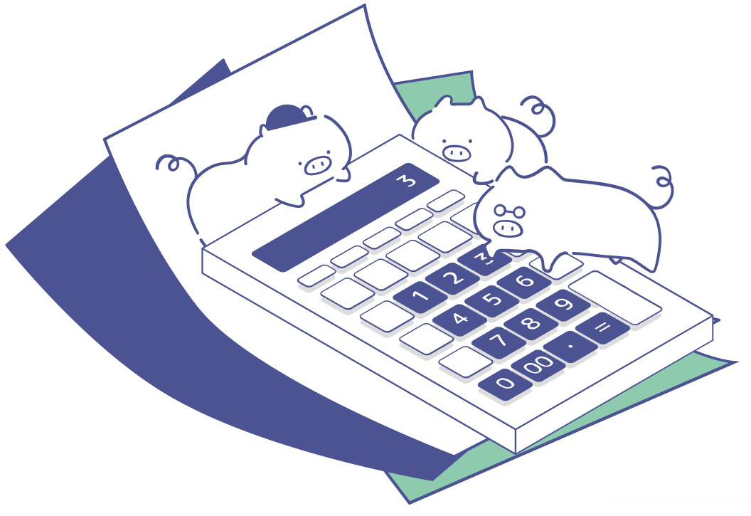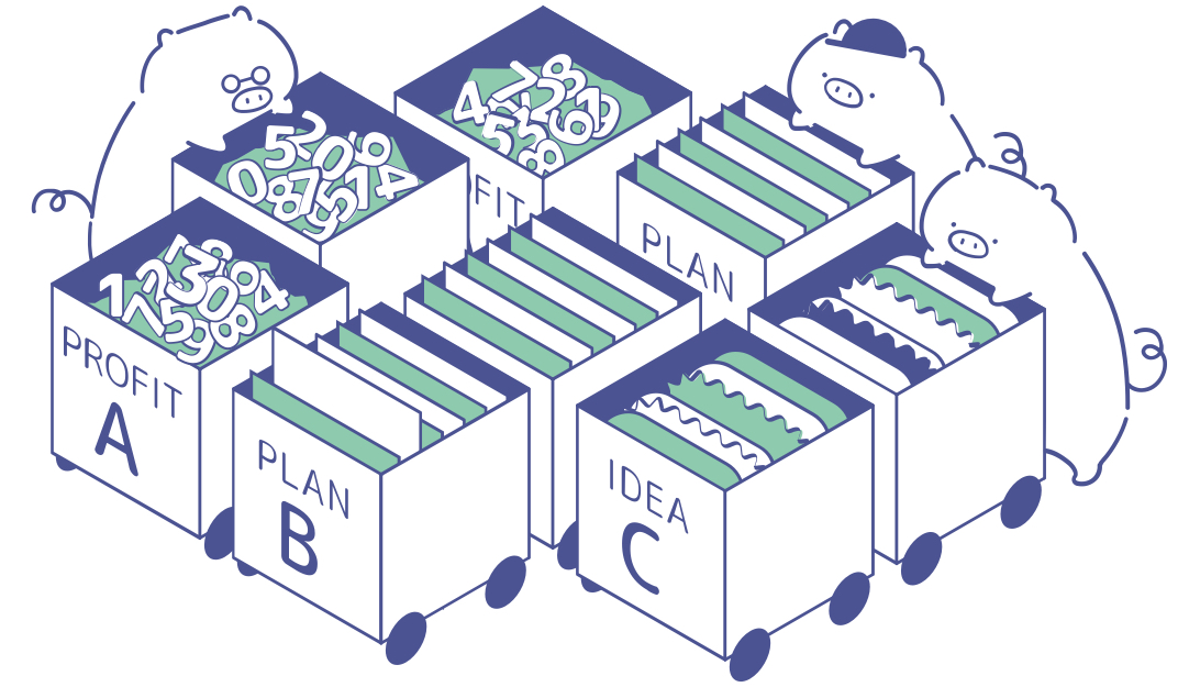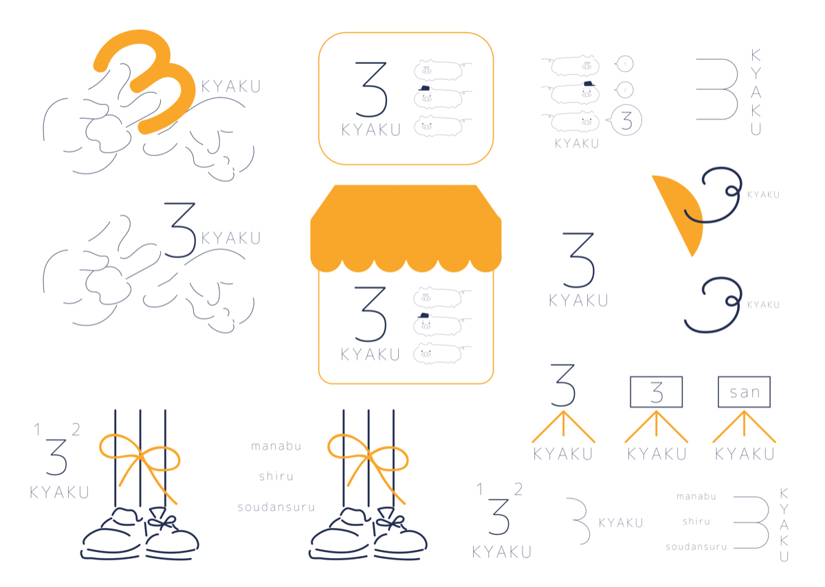 構想段階から、「サービス(私たち)/ユーザー/専門家」という登場人物や、縁起のいいことわざなどを意識し「3」という数字をキーにして作成していきました。ロゴと同じタイミングでキャラクターも考え始めていたので、ブタをイメージつけるものも含まれています。