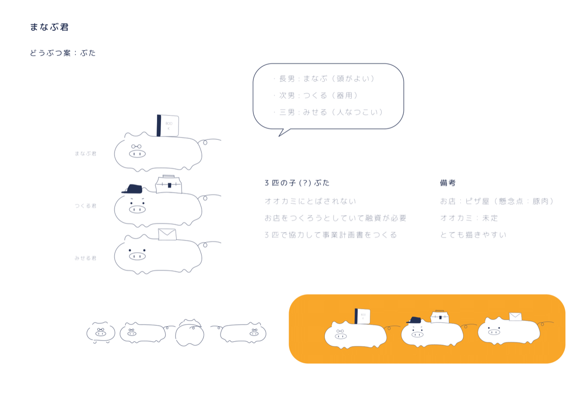第3案はキーワードである「3」から連想した「3匹のこぶた」からイメージをおこしました。「yagish(ヤギッシュ)」でキャラクターになったヤギの実績もあったため「動物キャラでいこう!」とブタに決まりました。