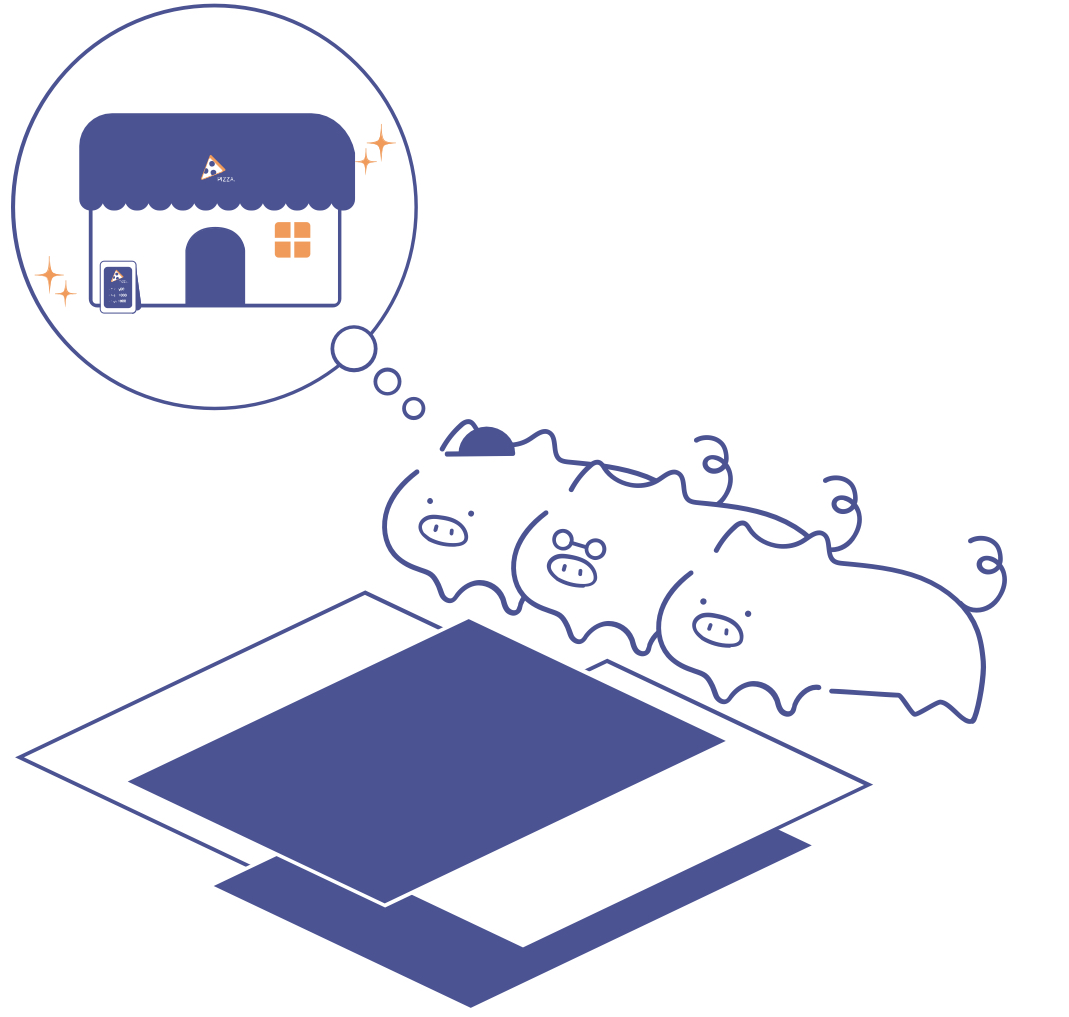 無事に融資を受けられ、ブタたちが開いたお店が大繁盛しているイメージです。ユーザーがこのサービスを使うことによってお店が成功するというゴールを意識しています。窓際ではいい香りにつられて、オオカミがピザを食べたそうにしています。