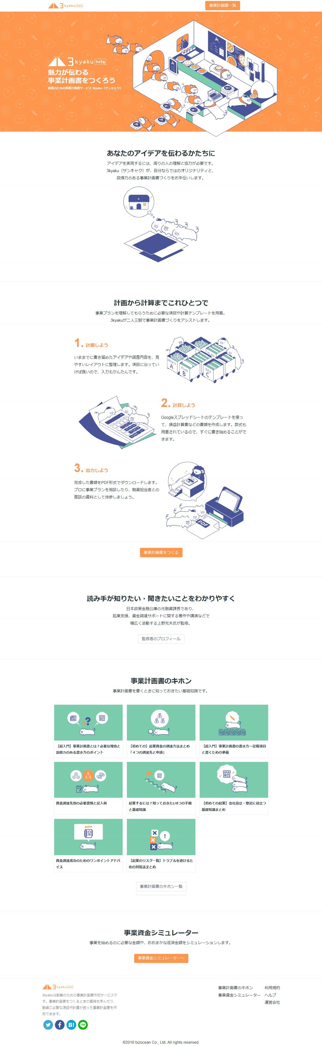 「事業計画書作成サービス 3kyaku(β版)」とは、融資のための事業計画書をブラウザ上で作成できるサービスです。はじめて事業計画書という高い壁に立ち向かう人の支えになりたいという想いが込められています。このサービス内に登場するキャラクターとロゴ作成、イラストなどを作成しました。