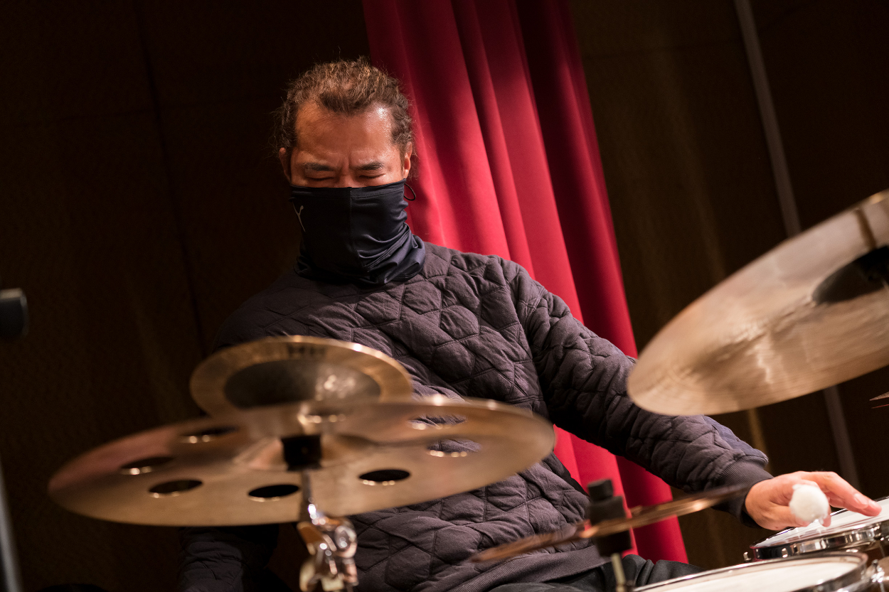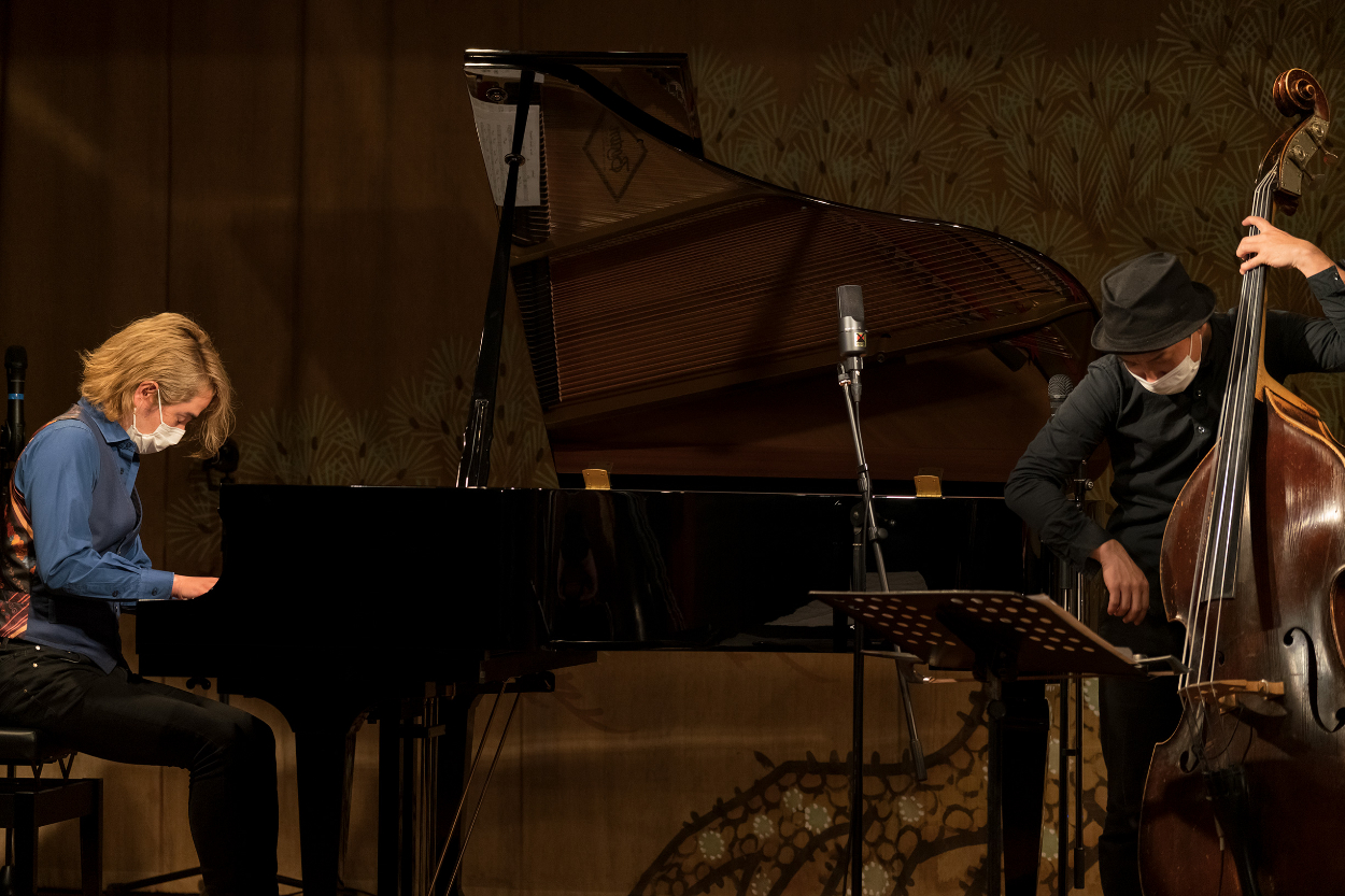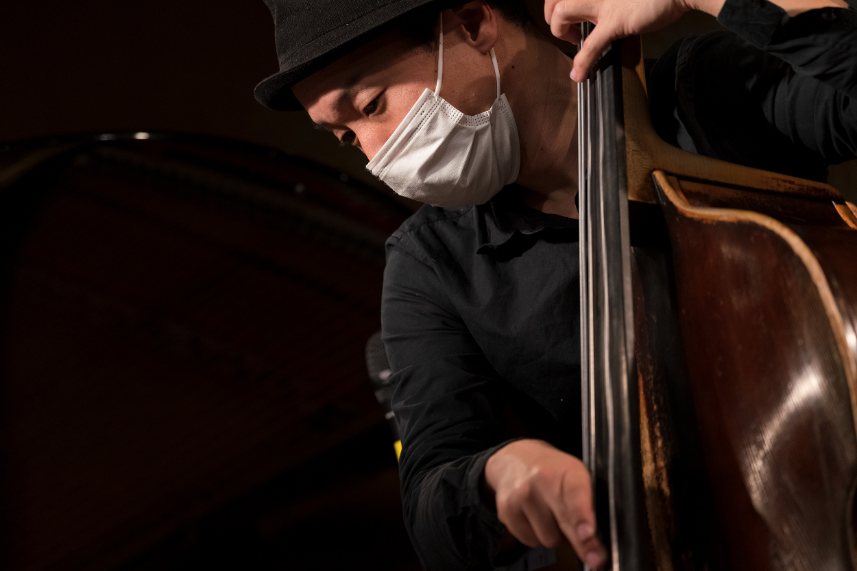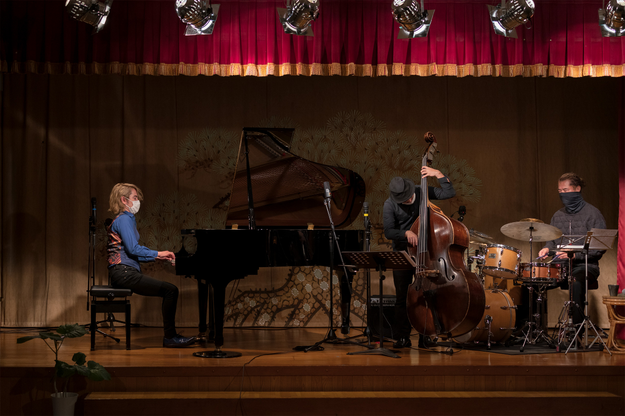 初潮旅館で開催された海音ジャズのライブ撮影。ピアノは松本圭使さん、ベースは権上康志さん。ゲストにはドラムの藤山"E.T."英一郎さん。緊急事態宣言により無観客での収録ライブとなりました。