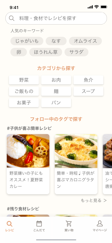 「時短・簡単」などテーマでレシピを絞り込め、そこにすぐアクセスできるUIが良い
