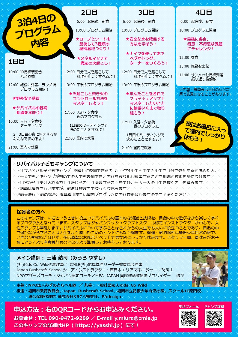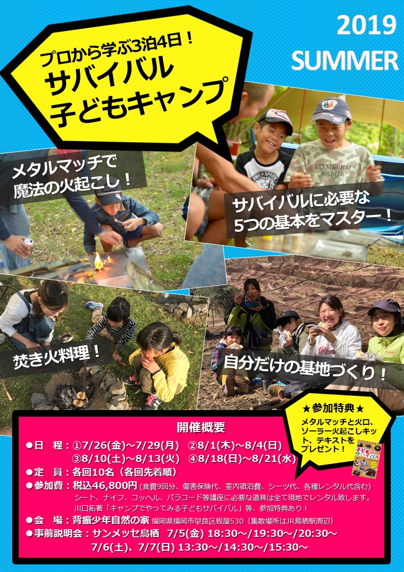 サバイバル子どもキャンプのチラシ作成 橘 敦子 災害対策インストラクター OVERVIEW 2019年の夏に行われたサバイバル子どもキャンプの参加者募集チラシを作成しました。 YEAR 2019 ・A4サイズ、両面カラー・ライティング