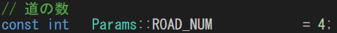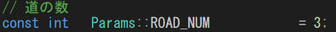 そしてここで僕がこだわったところがこのように、「ROAD_NUM」という定数の値を変えるだけで障害物、プレイヤー、彼女の初期位置が変わり、障害物の自動生成もちゃんと3レーンから4レーンに対応したものになり、レーンも自動生成されるところです。レーンの数が奇数か偶数によってレーンの中心位置も自動で切り替わるようになっています。