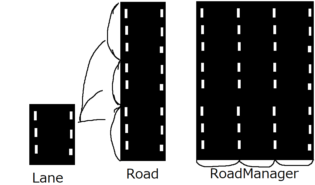 ステージであるレーンはこのような構成となっており道路一つ分の「Laneクラス」があり、それを「Roadクラス」で配列で管理して縦に複製、さらにRoadクラスを「RoadManagerクラス」で配列で管理、横に複製をしています。