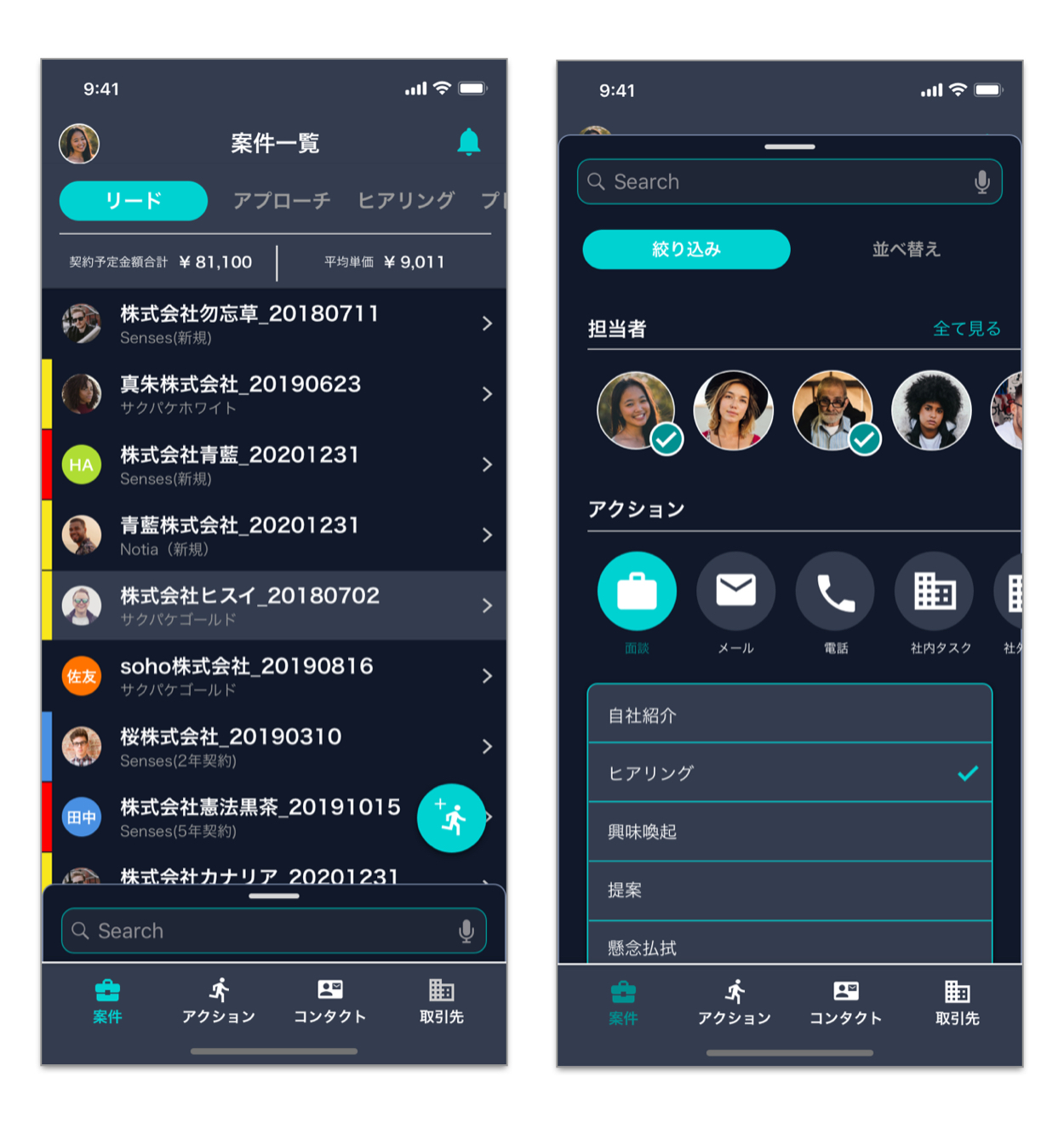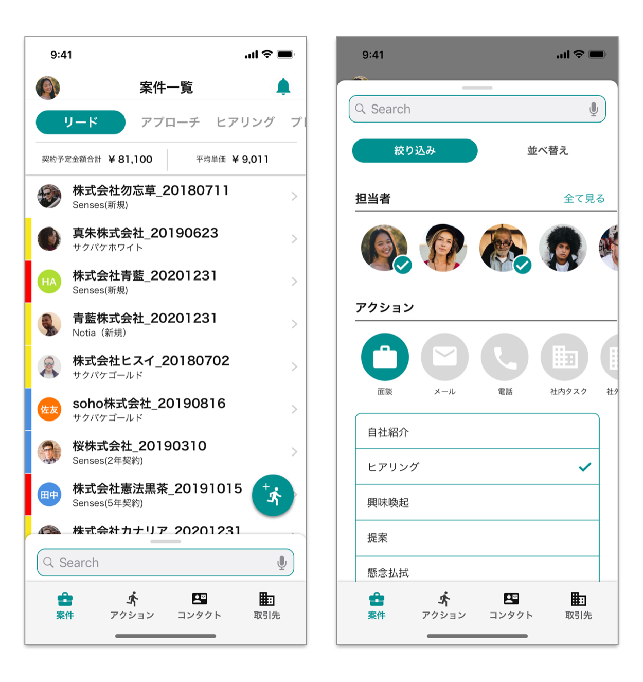 ベースとなる画面を「案件」「アクション」「コンタクト」「取引先」の主オブジェクト一覧とし、各詳細をモーダル化。