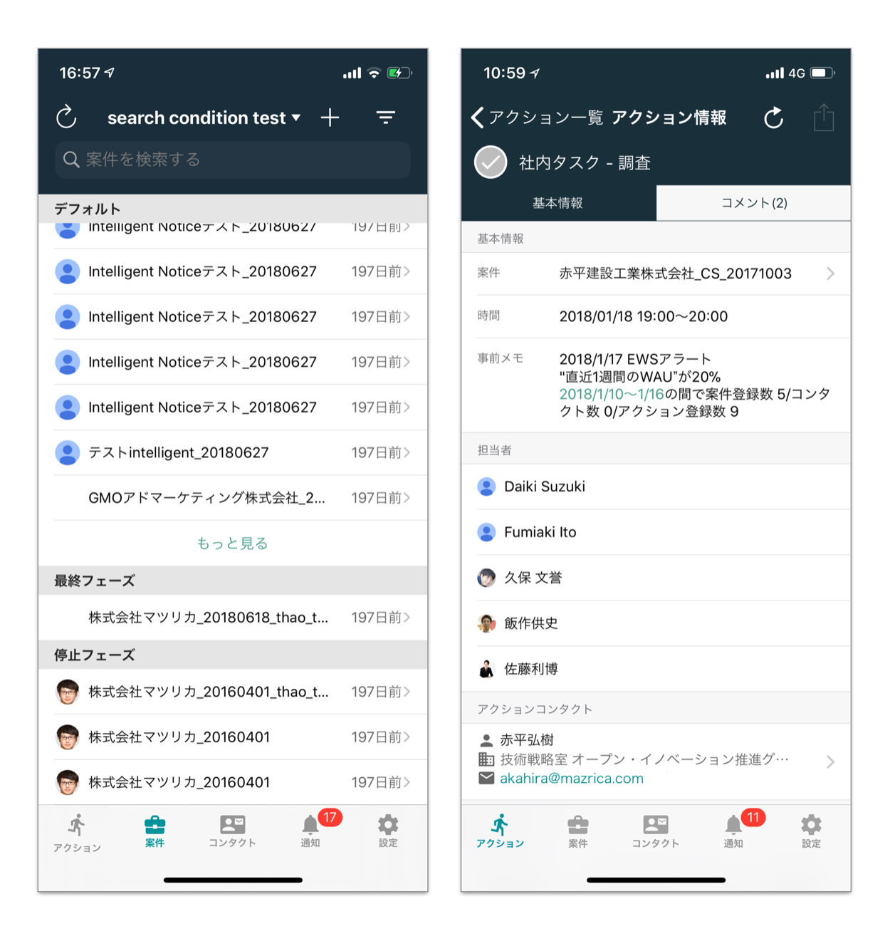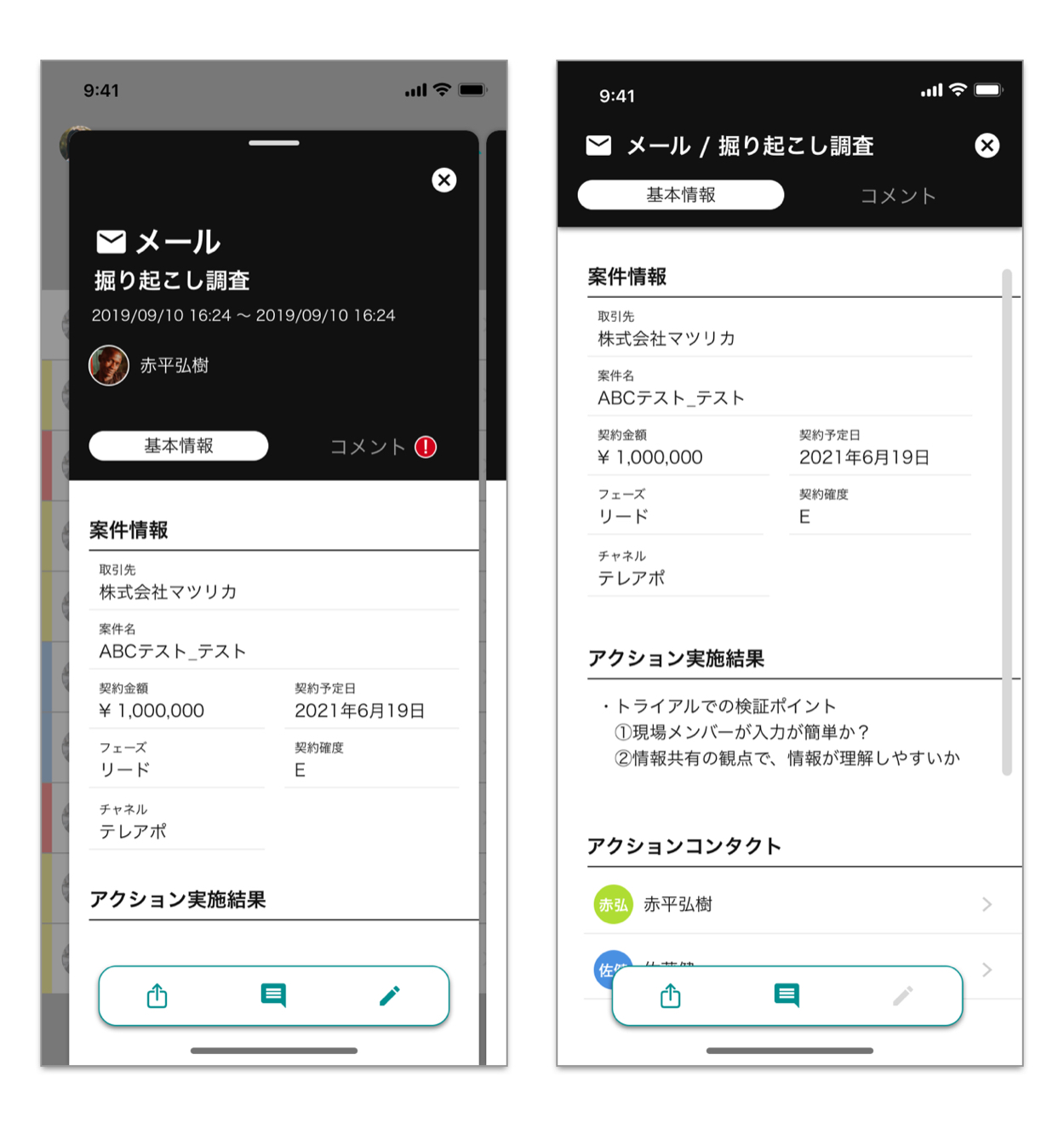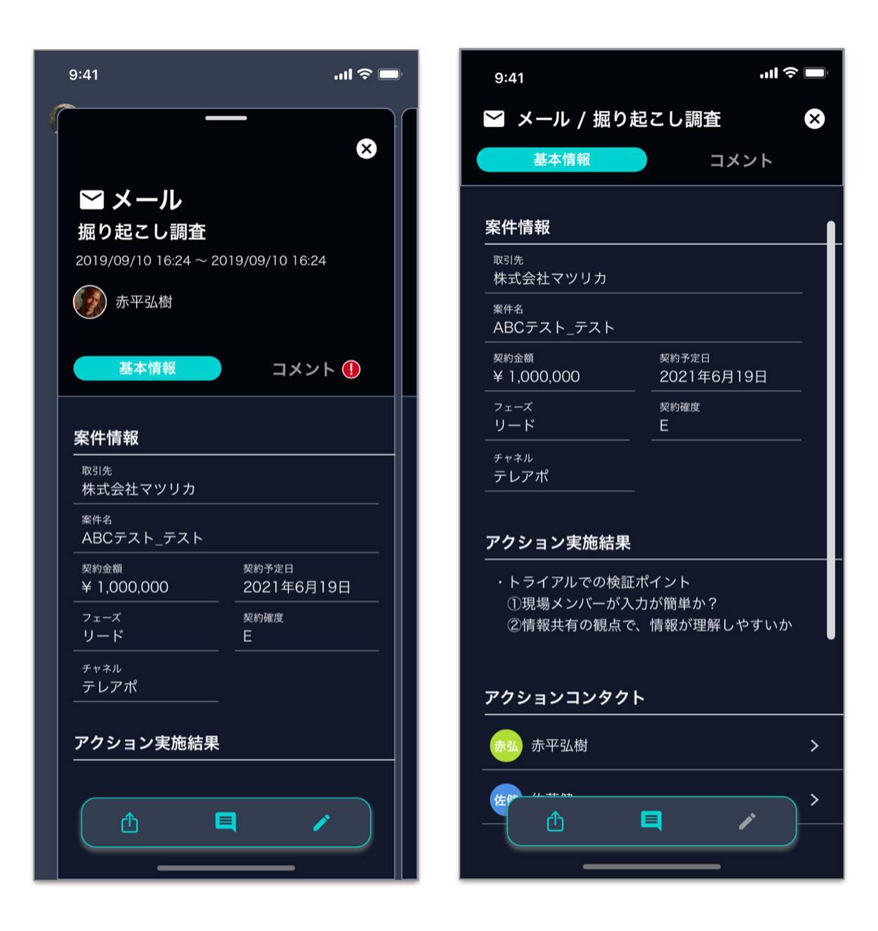 全画面にタブバーが表示されているため、詳細画面側で行う操作が上部のナビバーに集中し、「アクション・案件の追加」などのよく行う操作が片手で操作しにくい。