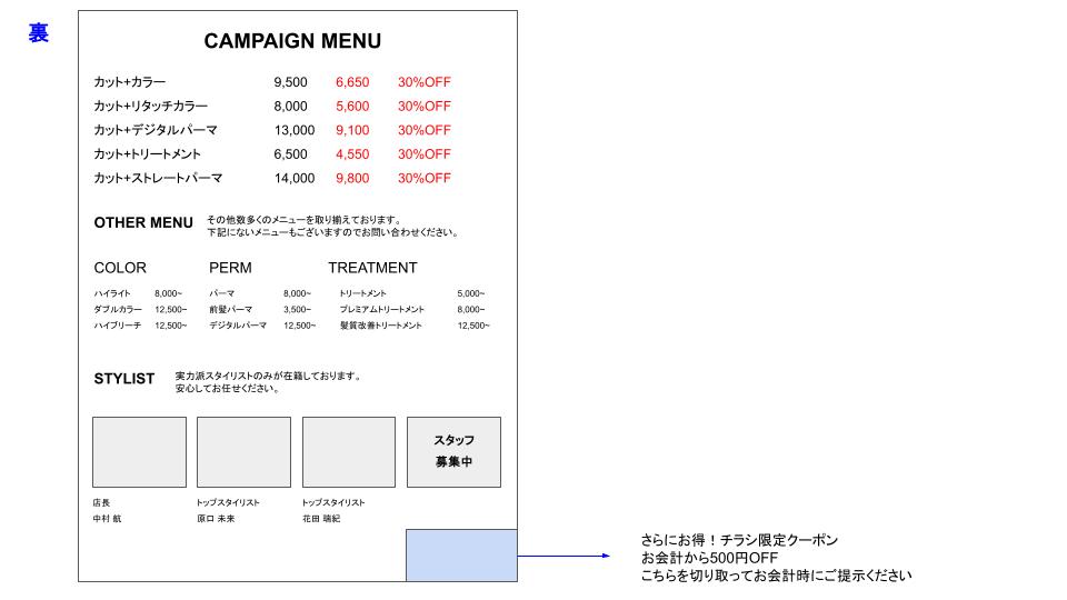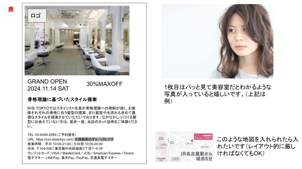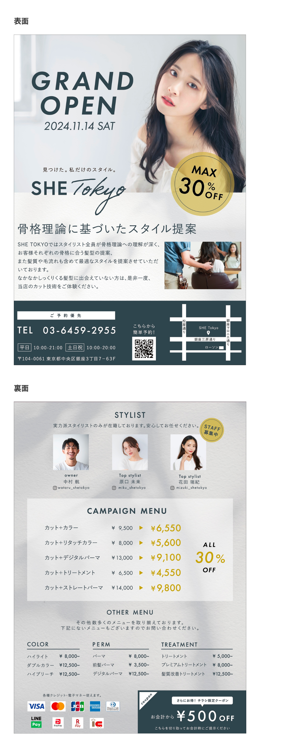 SHElikes MULTI CREATOR COURSE の課題にて、架空の美容室のオープンフライヤーを制作しました。(制作期間:1週間)