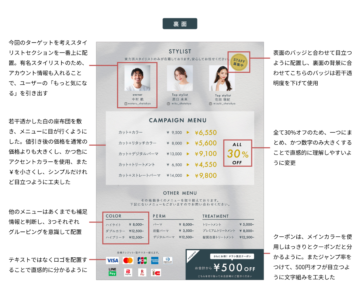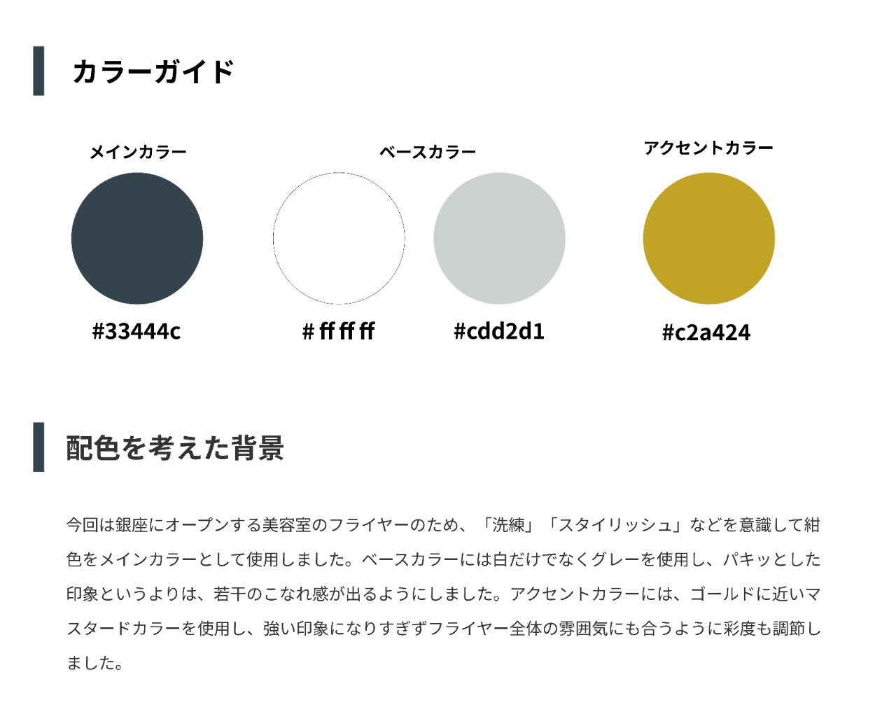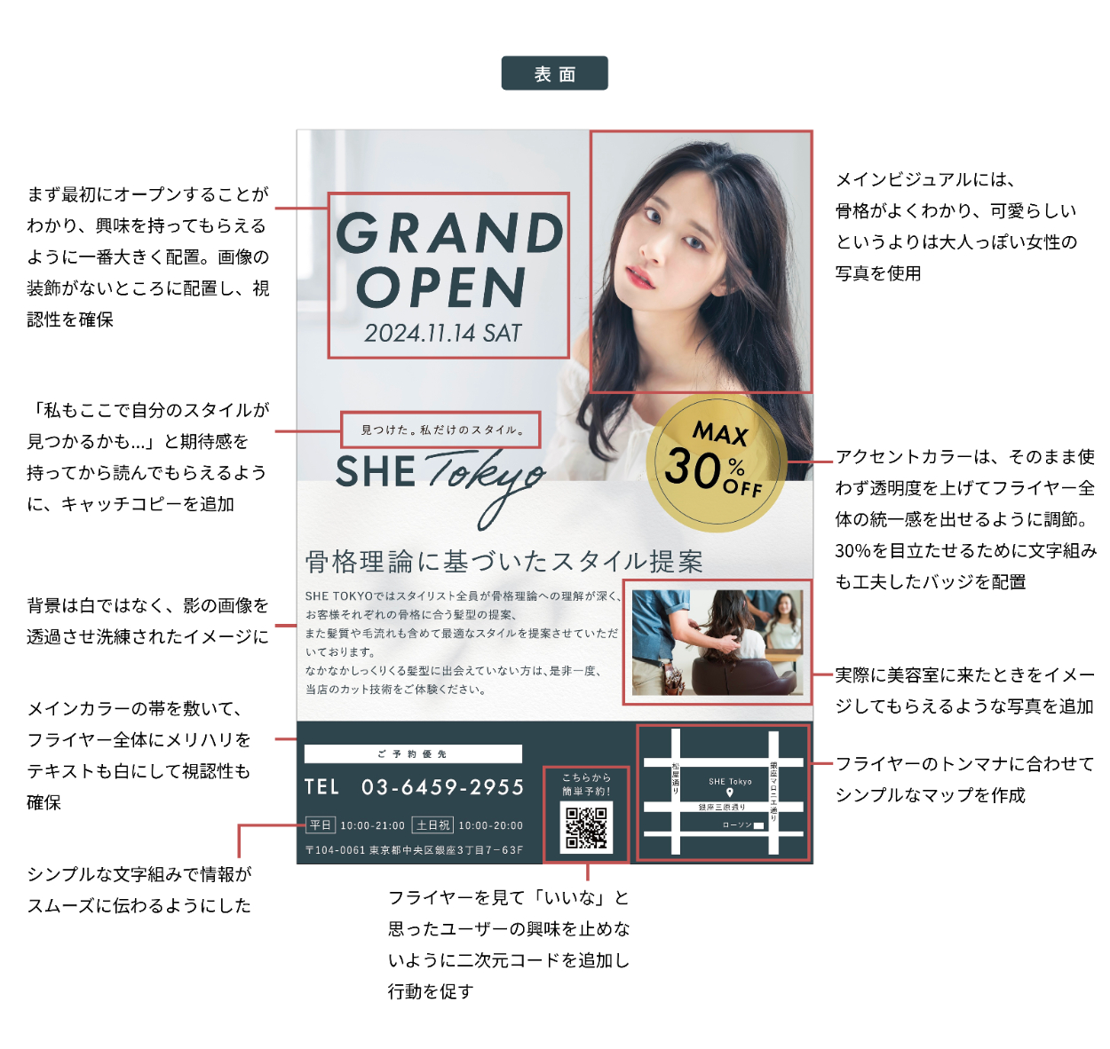 全体的には、洗練されたイメージを出すために、シンプルだけれど余白を意識して見やすいフライヤーになるよう心がけて制作しました。