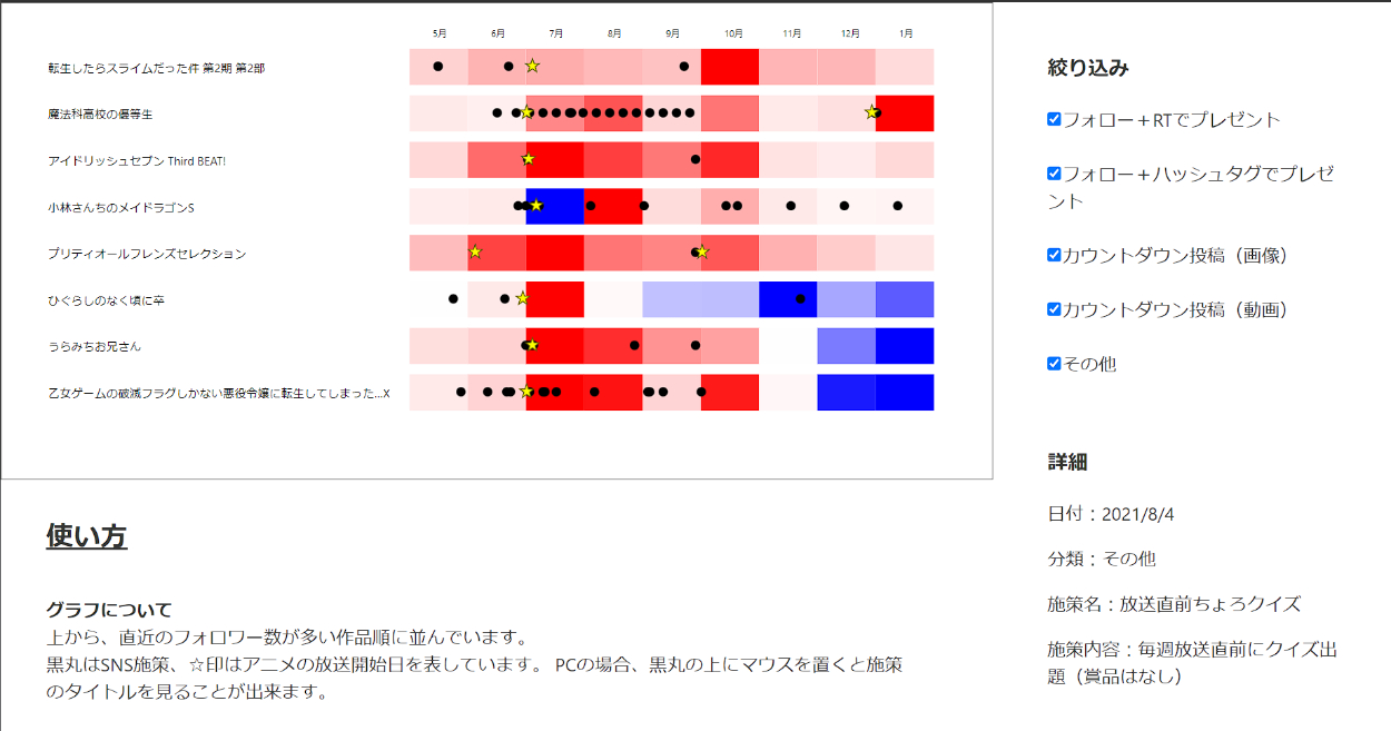 anime vis kumastry 大学院生 OVERVIEW チーム制作:アニメ作品フォロワー可視化サイト YEAR 2022 2021年7月期のアニメ番組のTwitterフォロワー数TOP8の変動の可視化コンテンツ本来の力で伸びたか施策の力で伸びたかを見ることができるどのような施策が多かったかを見ることができるフォロワーの伸び率が大きい月は赤色、減少した月は青色で表示されるスクリーンショットGitHub WEBSITE