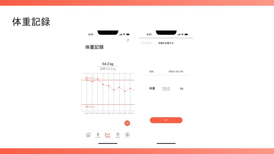 デザインは「見た目記録」と同様に変化の可視化を意識し、最新体重と目安の目標体重がひと目で確認できること、横スクロールグラフで体重変化の推移がわかることの2点を特に工夫しました。