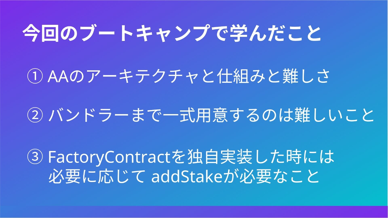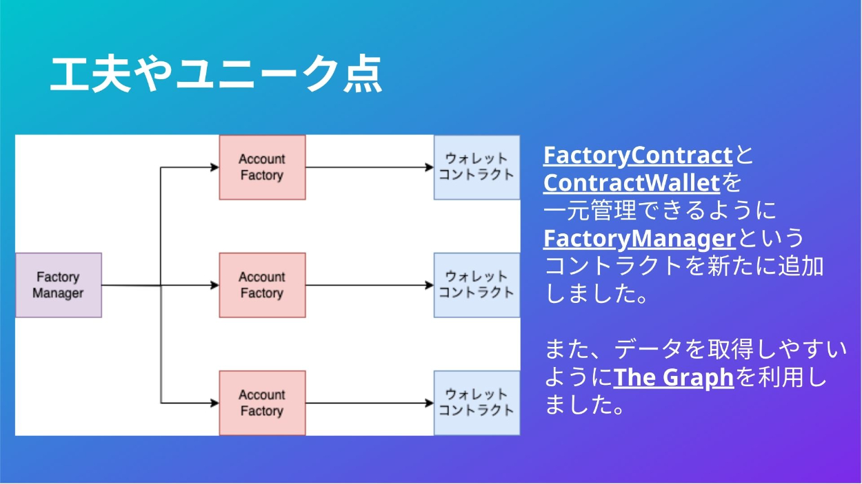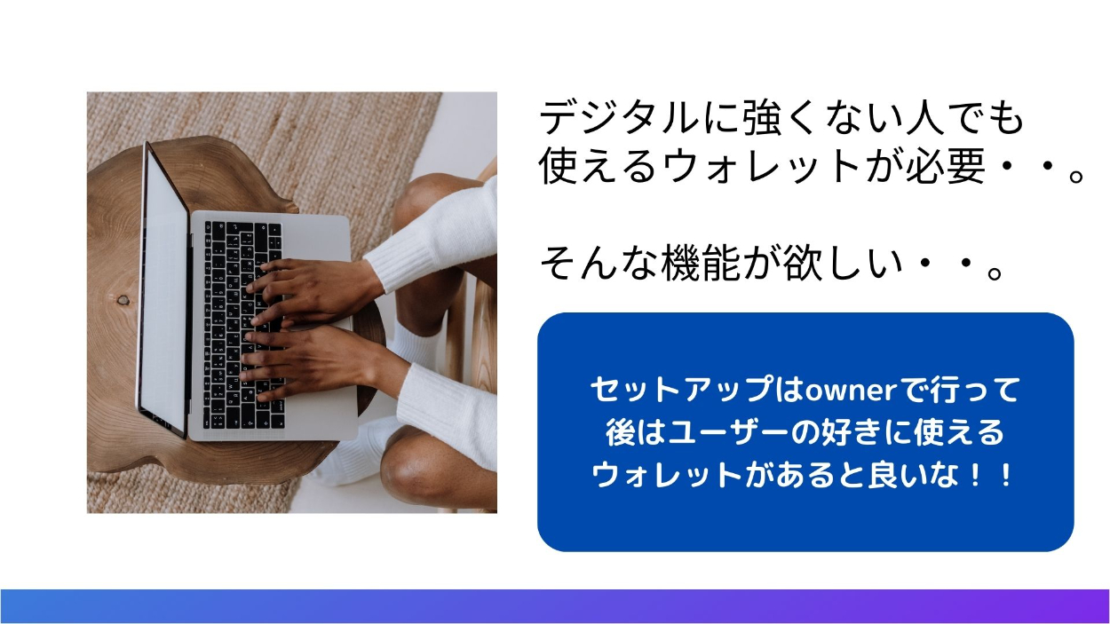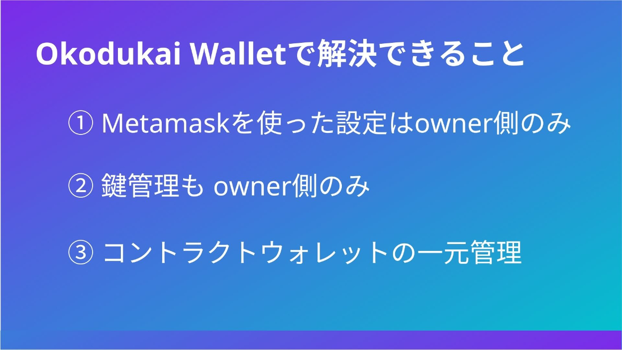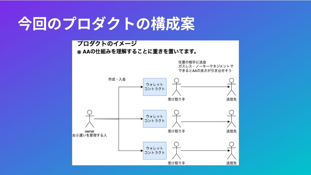 【CRYPTOLAND Boot Camp】Okodukai Wallet 近藤 晴輝 ICTエンジニア OVERVIEW Account Abstractionを利用したウォレットアプリ YEAR 2023 - 2023 CRYPTOLAND Boot Camp で Okodukai Walletを作りました! ユーザーが気軽に暗号資産を送金できるプロダクトです! ※ ownerは、鍵管理必要! デモ動画ソースコードツイート発表資料 WEBSITE