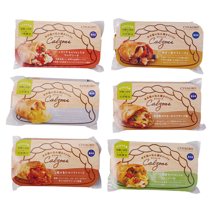 |パッケージデザイン|CINAGRO 冷凍カルツォーネ Hiromi.M グラフィックデザイナー OVERVIEW オーガニックレストランCINAGRO監修 冷凍カルツォーネ 全10種 パッケージデザイン