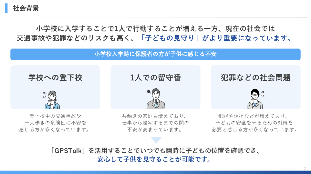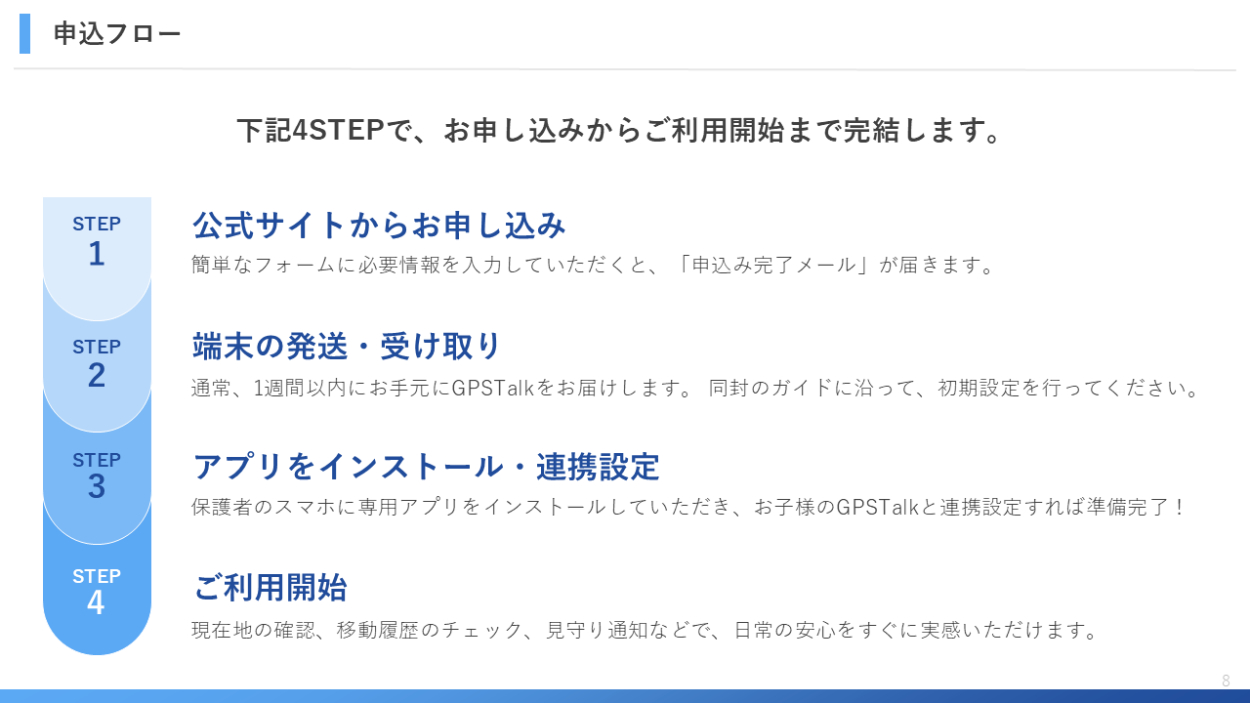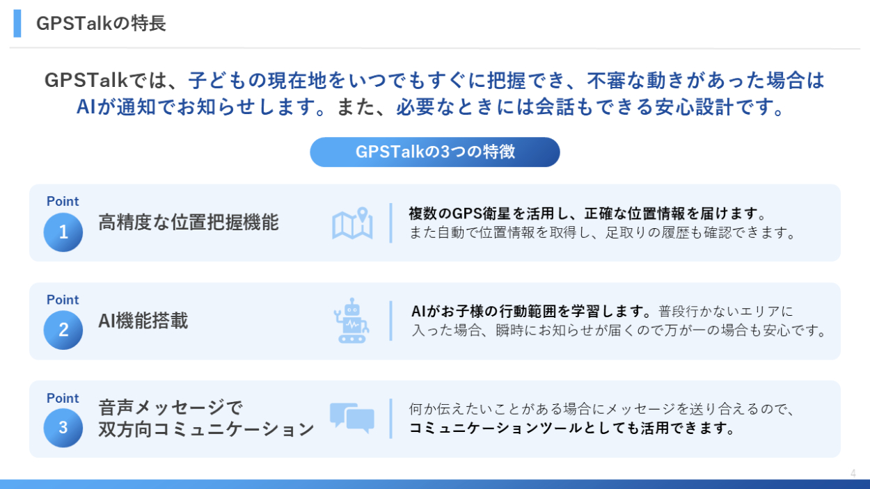 【自主制作】サービス紹介資料 Office SATSUKI スライドデザイナー|Webデザイナー|秘書 OVERVIEW 自主制作としてサービス紹介資料(音声機能付きGPS)を作成しました。 YEAR 2025 信頼感のあるブルーを使用し、モックアップやイラストも取り入れてサービスの特徴や強みがしっかりと伝わるよう作成しました。※構成案・テキスト情報をもとにデザインを担当しました。使用ツール:PowerPoint