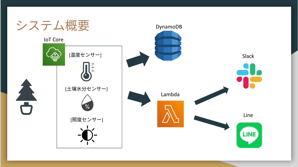 あとはLambdaで,値が閾値を超えているかだけの超シンプルな処理を行い,結果に合わせてLINE Bot & Slackで送信した。(期間内に電話番号を発行できず,Amazon Connectで電話かけられなかったため,デモ用の代替措置が必要だった。唯一の心残り…)
