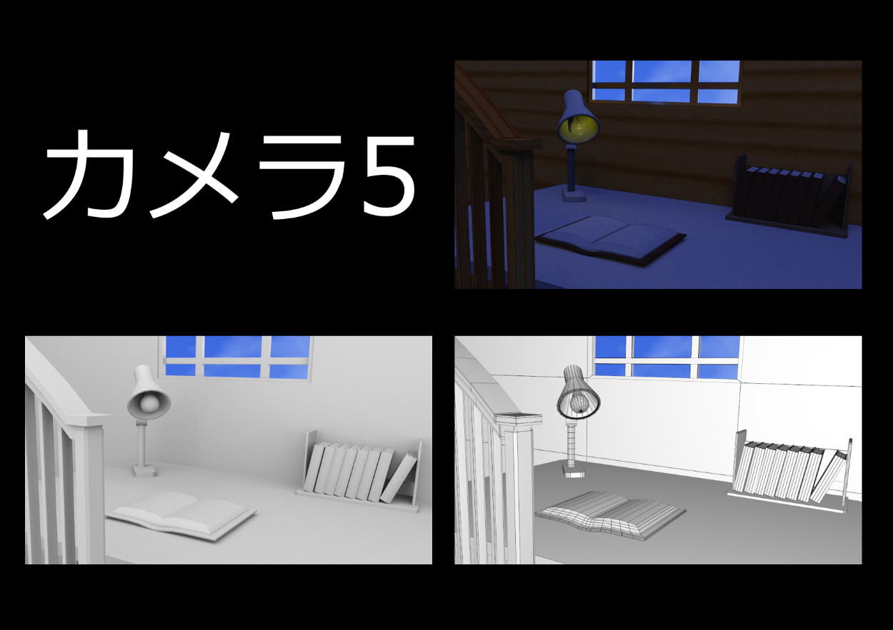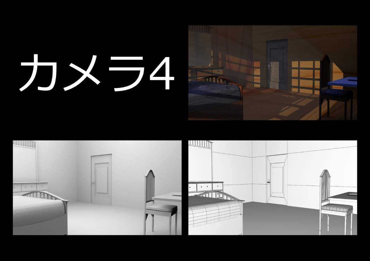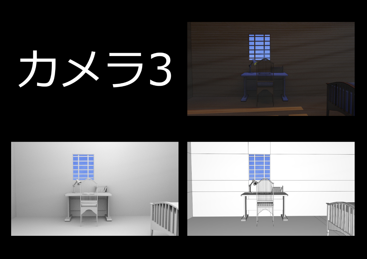 日差しを特に強調したかったのであまりライトを置かずに暗い部屋に日差しが入り込んでいる感じを出しました。日差しはスポットライトにfogを使い表現しました。綺麗に表現できたと思います。