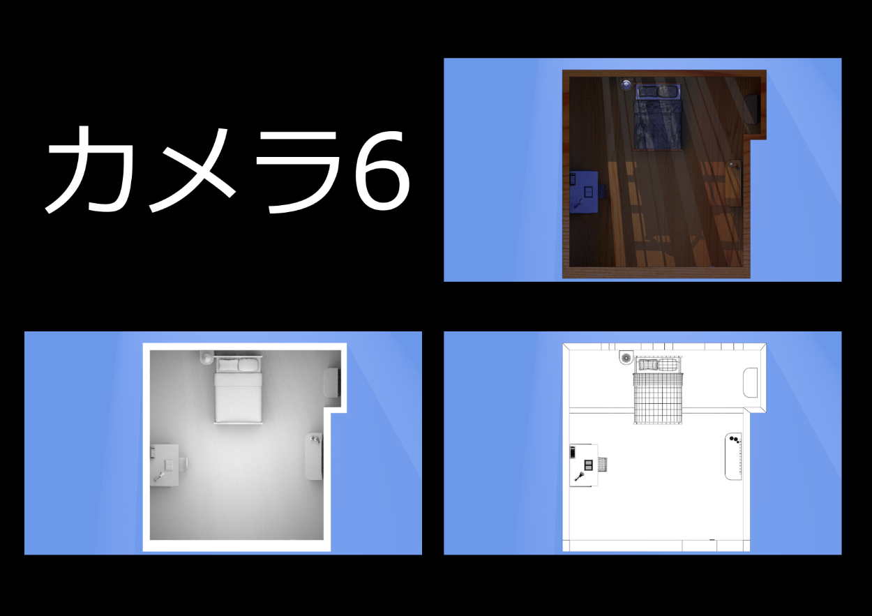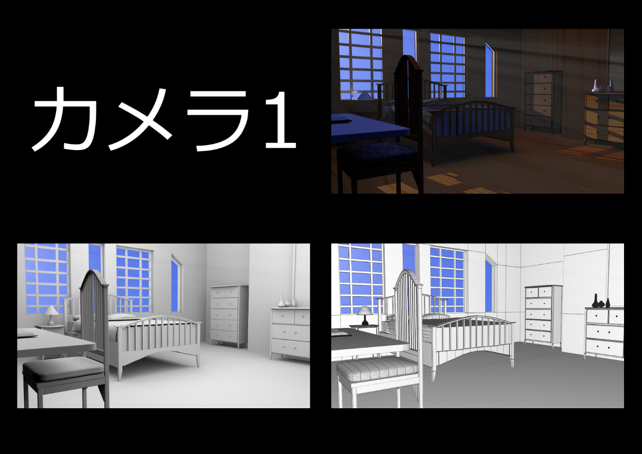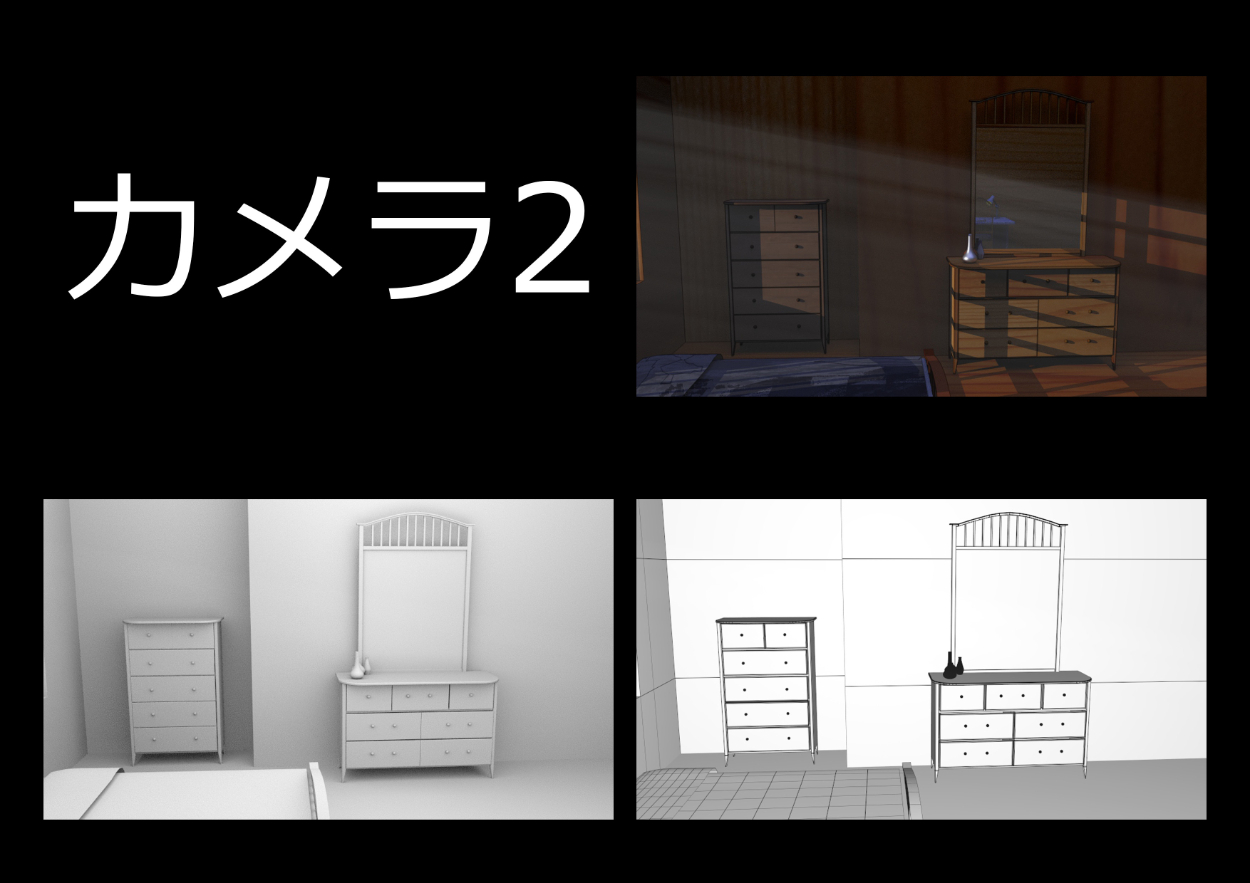 日差しを特に強調したかったのであまりライトを置かずに暗い部屋に日差しが入り込んでいる感じを出しました。日差しはスポットライトにfogを使い表現しました。綺麗に表現できたと思います。
