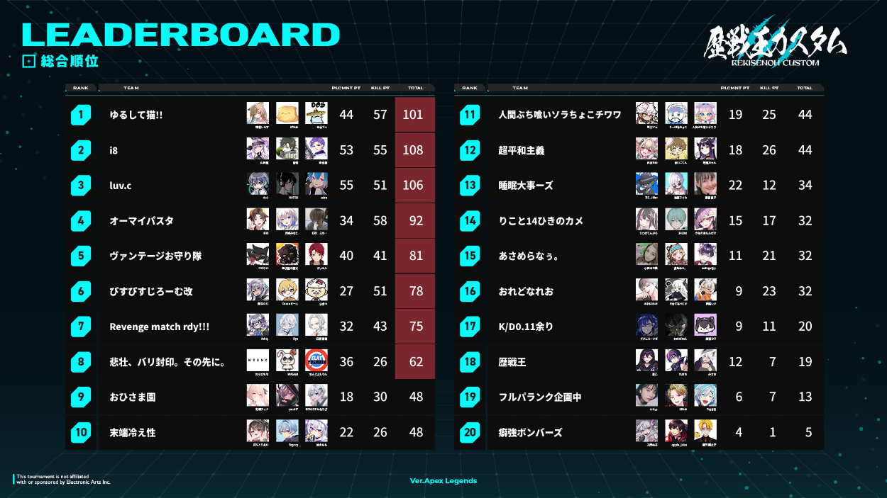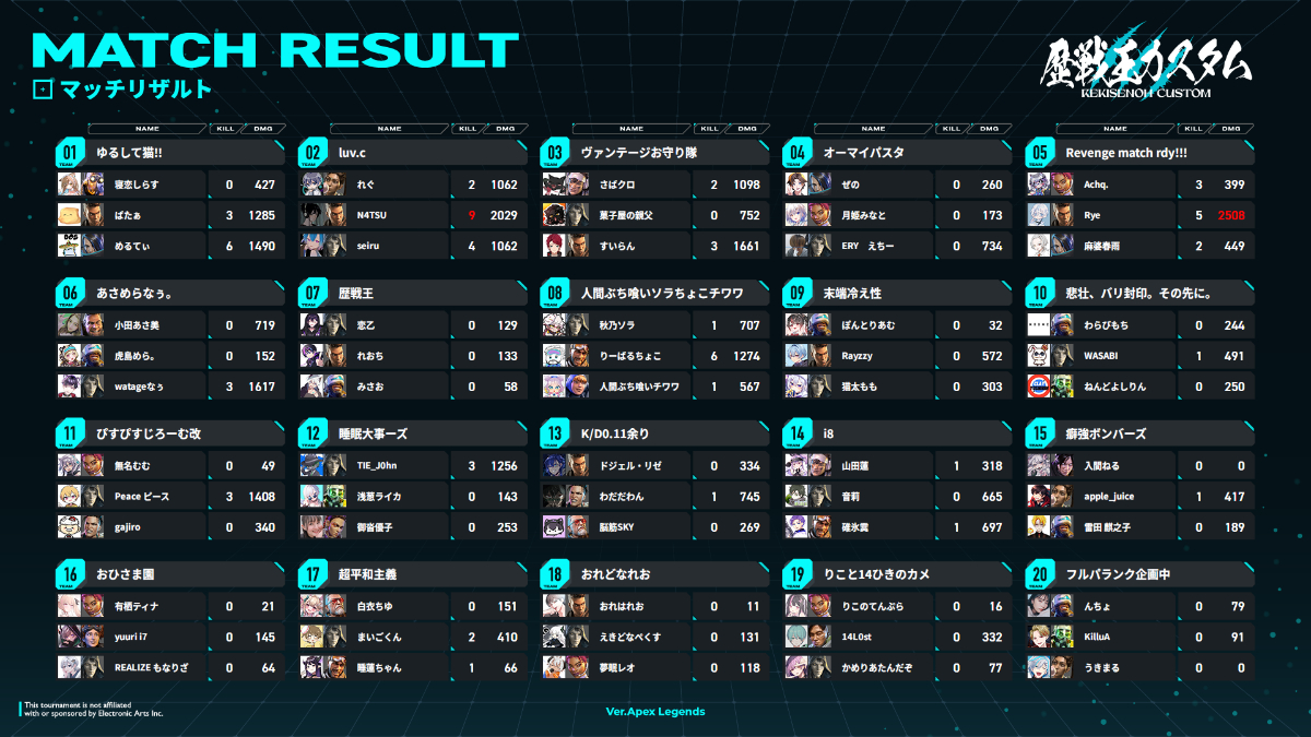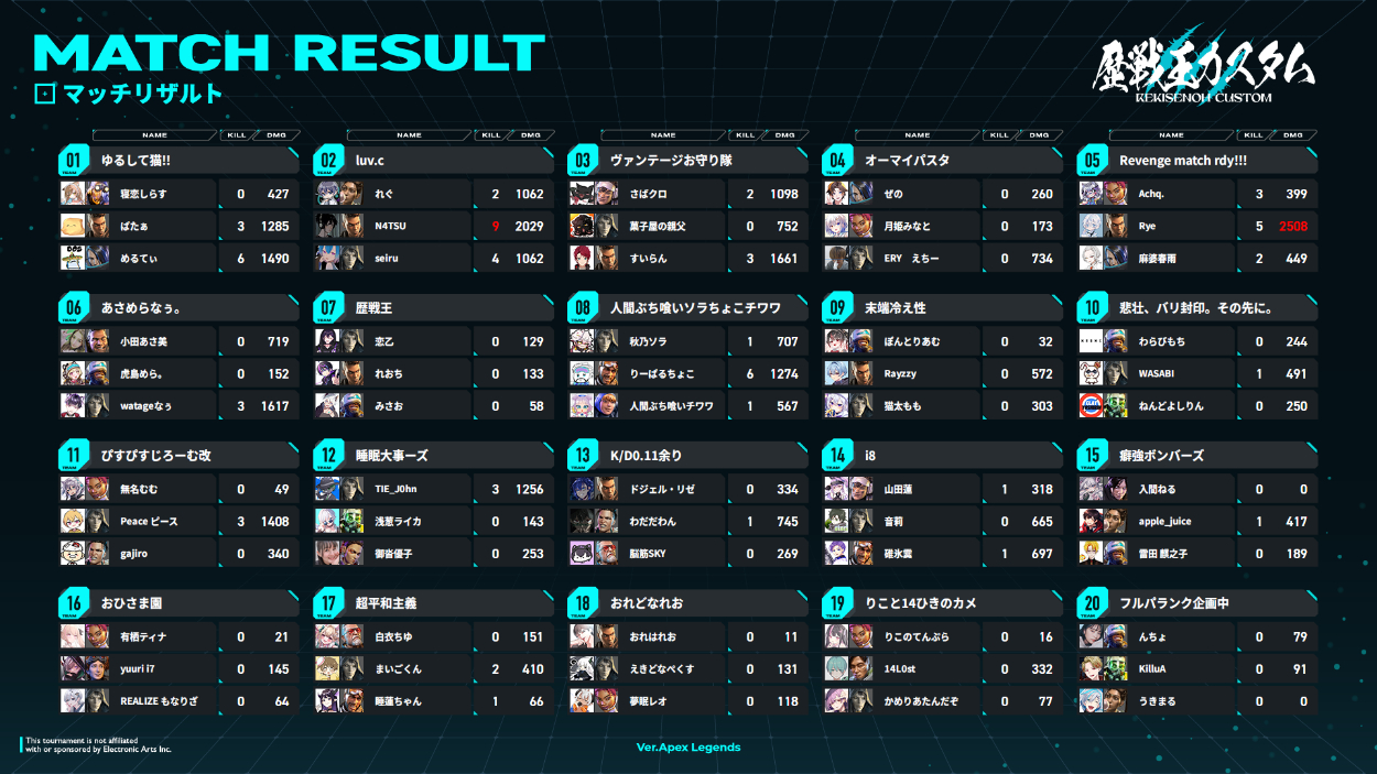 Apexカスタム大会である歴戦王カスタムにてスコア表プログラムを担当しました。 ゲームAPIからスタッツデータを取得し集計を自動で行いOBSでグラフィックを送出できます。 ※グラフィックデザインは行っていません、コーディングのみです。