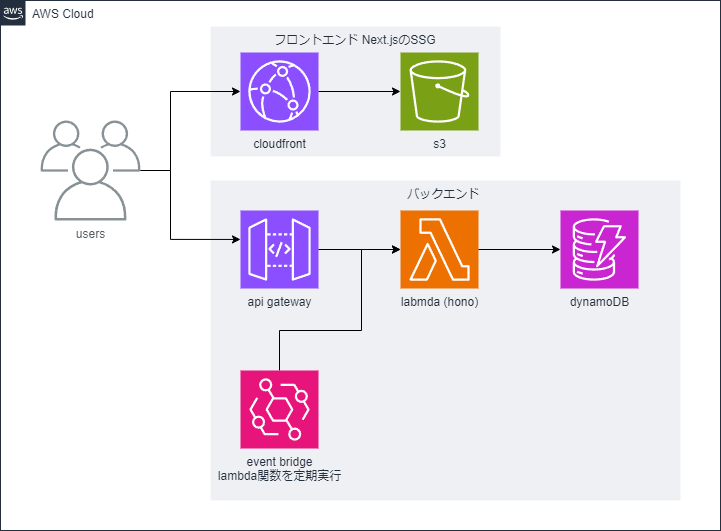 今回はバックエンドとしてhonoを採用しました。採用した理由としては軽量で高速に動作するaws lambda上にデプロイできるバックエンドフレームワークであったことや最近cloudflare上にデプロイできるバックエンドフレームワークとして話題に上がっていたことなどが挙げられます。honoを用いることでhonoで作成したエンドポイントをbuildして簡単にlambda関数としてデプロイ出来ました。