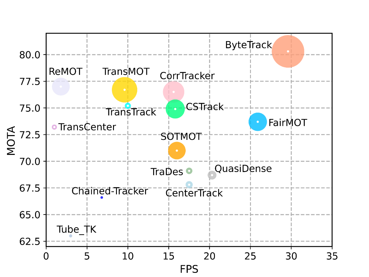 ByteTrackは、2021年10月に公開されたオブジェクトトラッキングのモデルです。Deep SortのようにReIDは使用していません。カルマンフィルタによるバウンディングボックスの移動予測のみでフレームを紐づけています。最初は高い確度のバウンディングボックスに対して、次に低い確度のバウンディングボックスに対して紐付けを行うことで、隠れたオブジェクトでも不検知になりづらい仕組みになっています。