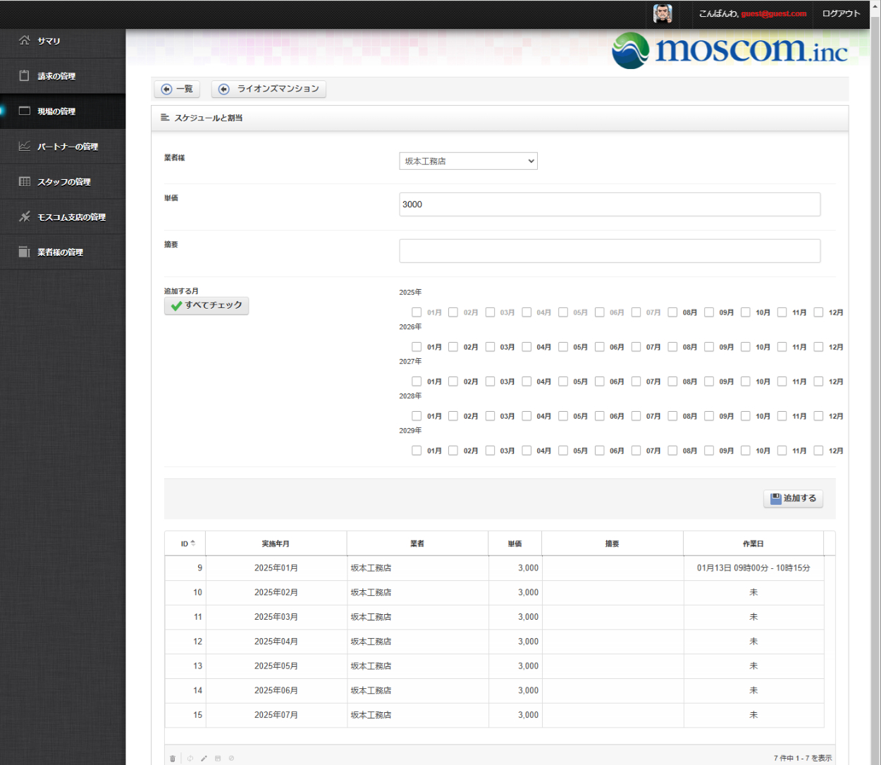 管理者画面 作業現場のタスクの契約期間の登録