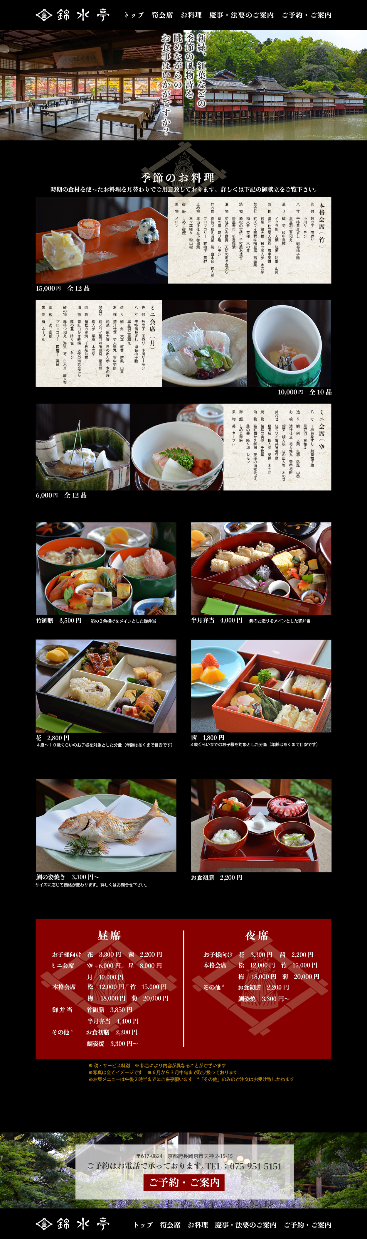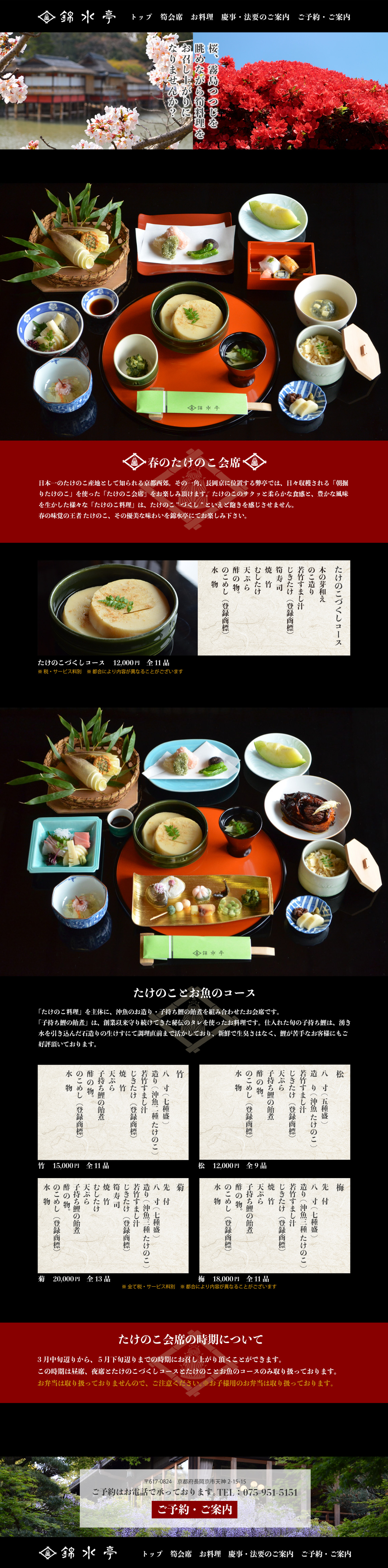 錦水亭の季節の会席料理の紹介ページです。和風な雰囲気を出すためにお品書きの部分に和紙を使用して、文字を縦書きにしました。筍会席の見出しと同様に紅葉や新緑のイメージ写真を使用して、コピーを入れました。