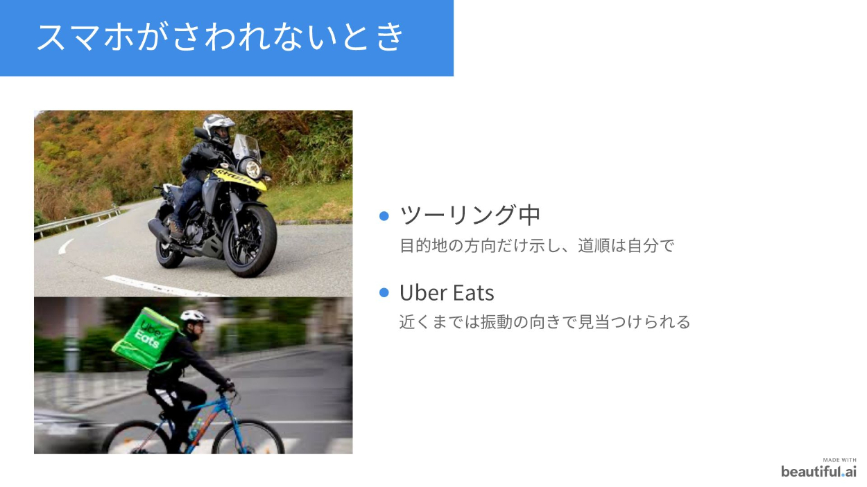 道順指定されずに気ままに行きたいというときや、ツーリング中、UberEats配達員用に目的地の方向だけ案内させるなど、スマホを見れない際のユースケースもあるでしょう。