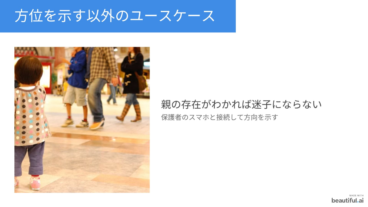 保護者のスマホと接続させて子供の迷子を防止する用途が考えられる他にも、