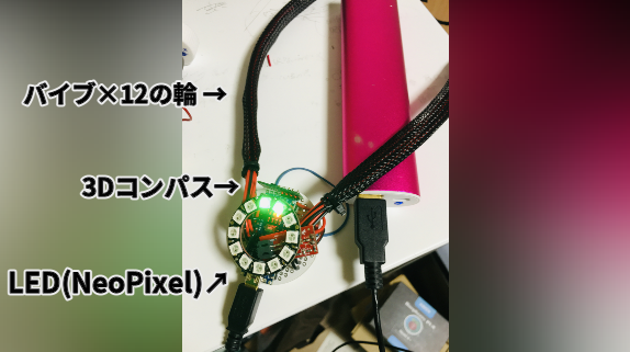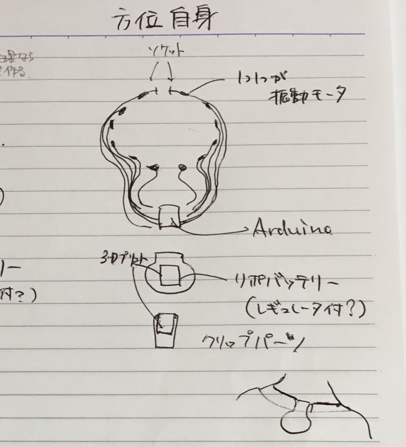 ネックレスの北に対応した場所が振動するようになっていて,首にかけて北の方向に振動を感じることで方位を体感することができるデバイスです.常に方向感覚を体に覚え込ませることで自然と方向音痴を治すことを開発の目的としています.