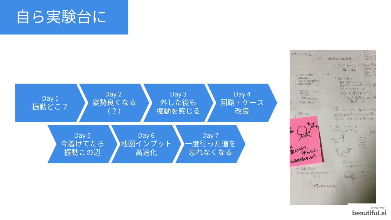 現在はまだ、方向や位置関係の認知支援に留まっていますが、意識的に振動を身体で感じ続けて体に覚え込ませることによって、最終的には方位自身を着用せずとも常に北を認識できるようになるのではないでしょうか。