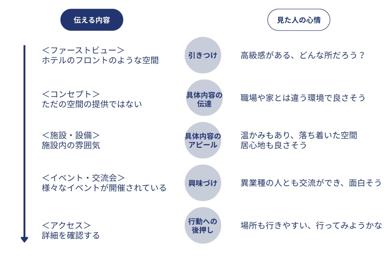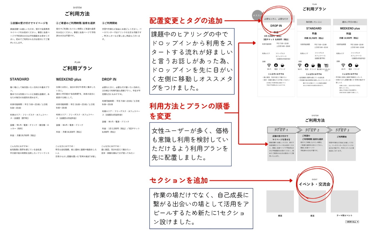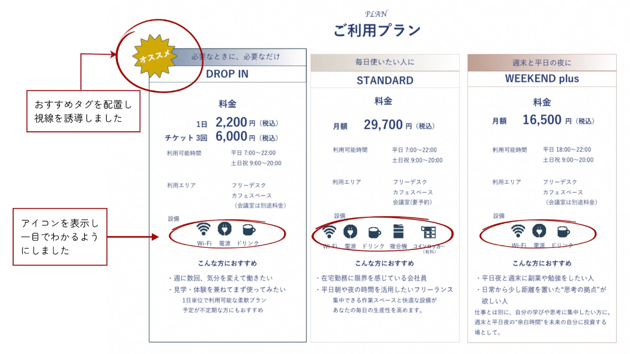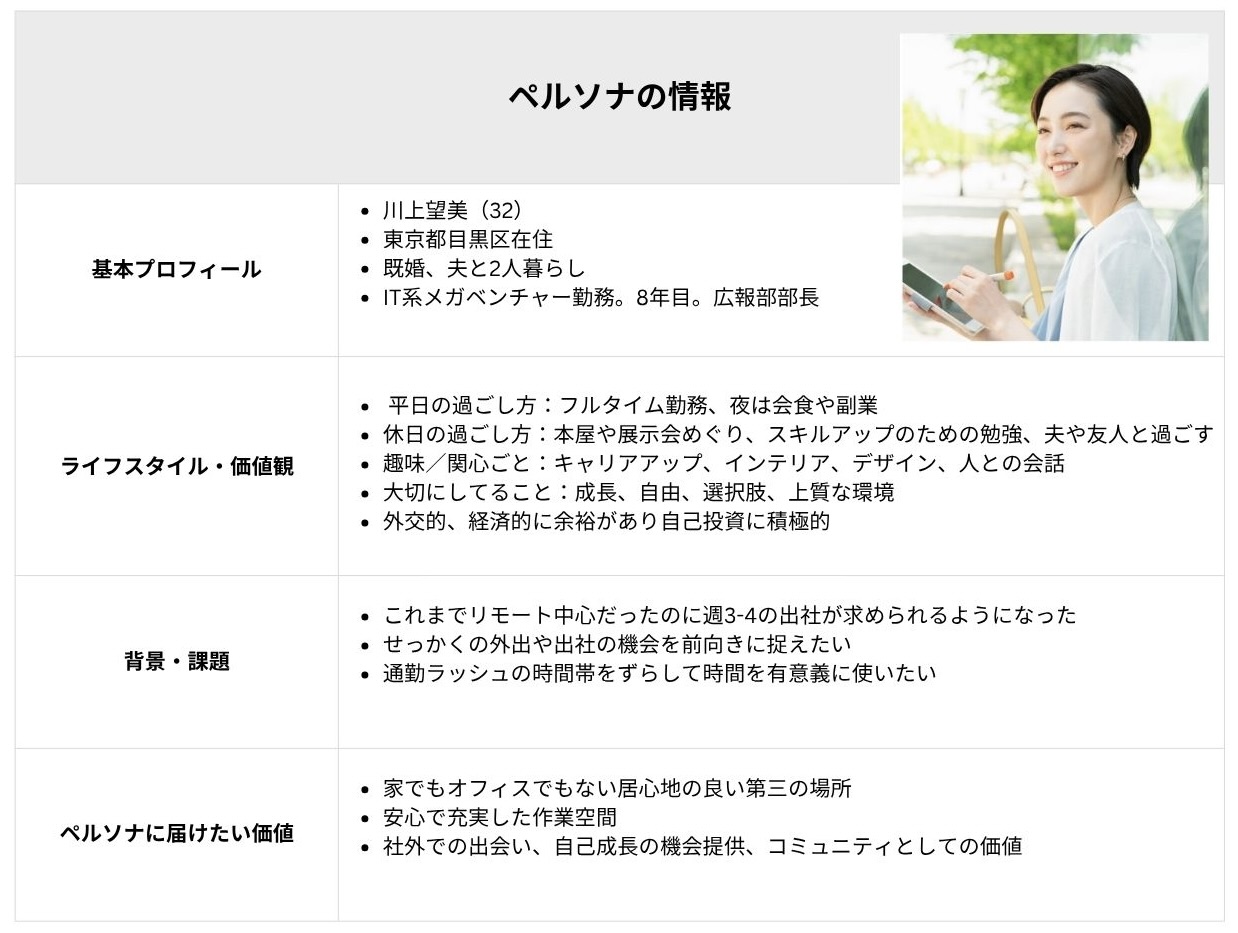 ・ペルソナ像や課題中のヒアリングより、自己成長に意欲的な女性・経済的に余裕がありお洒落な空間で勉強したいという内容から設定しました。