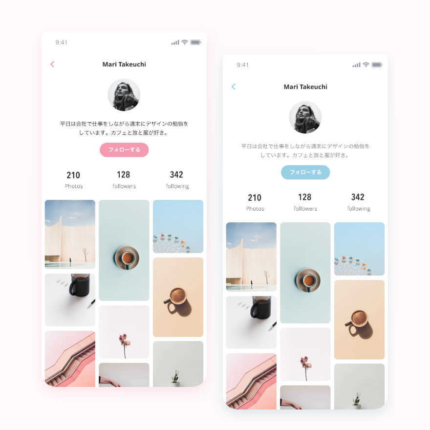 - レイアウトには余白を多くもたせベースカラーは白にすることで落ち着きを出しつつ、ポイントカラーは動作部分にのみ着色し彩度の高いホットピンクで最小限のPOPさも取り入れました。