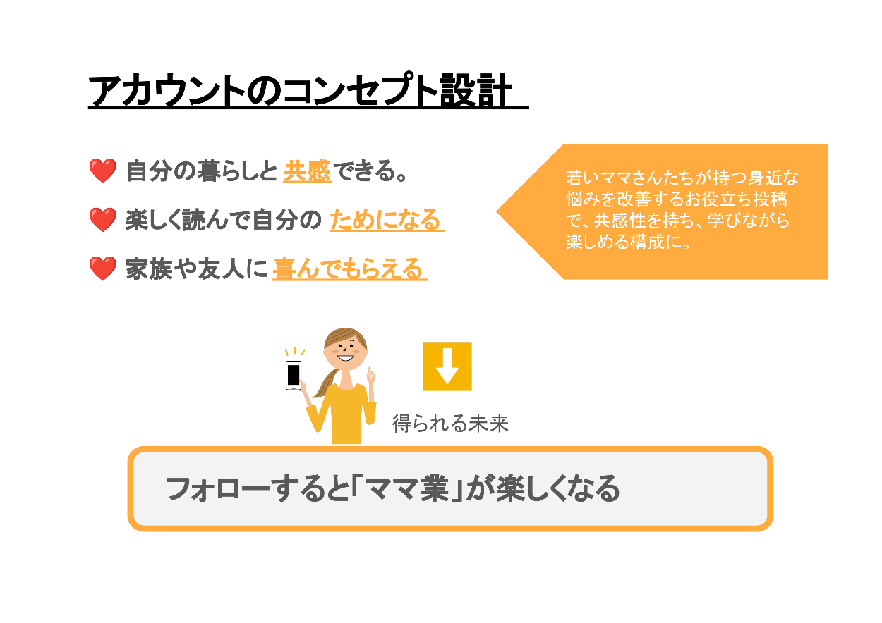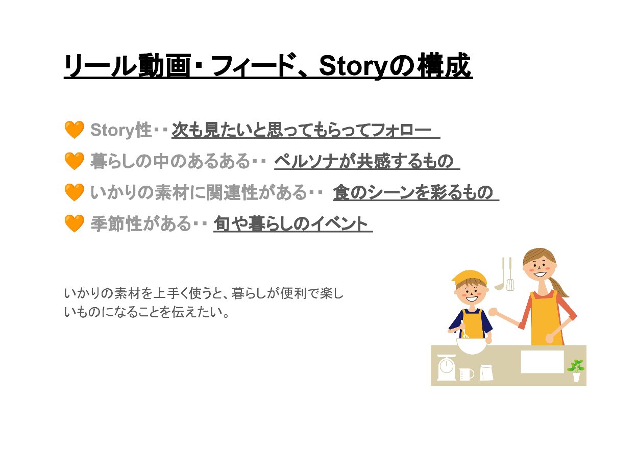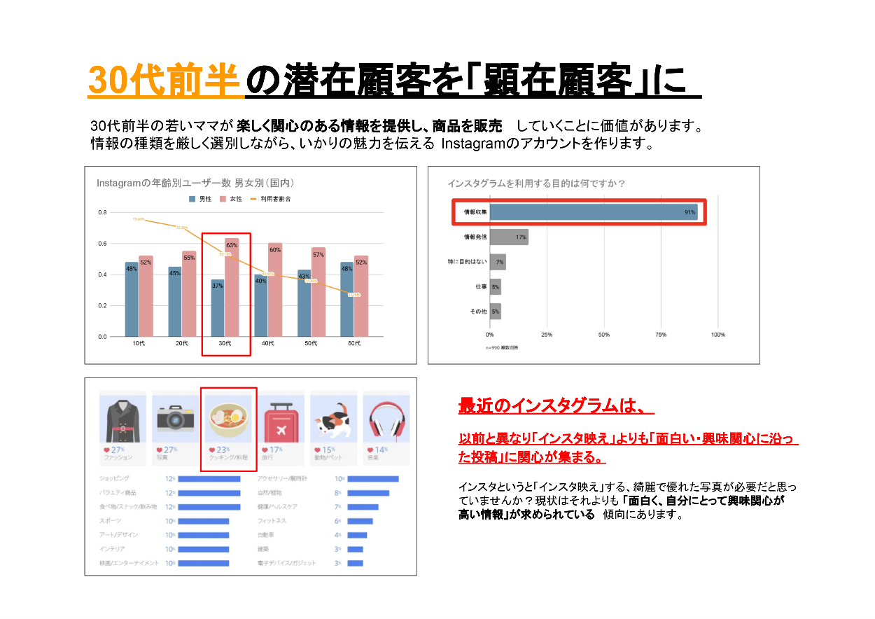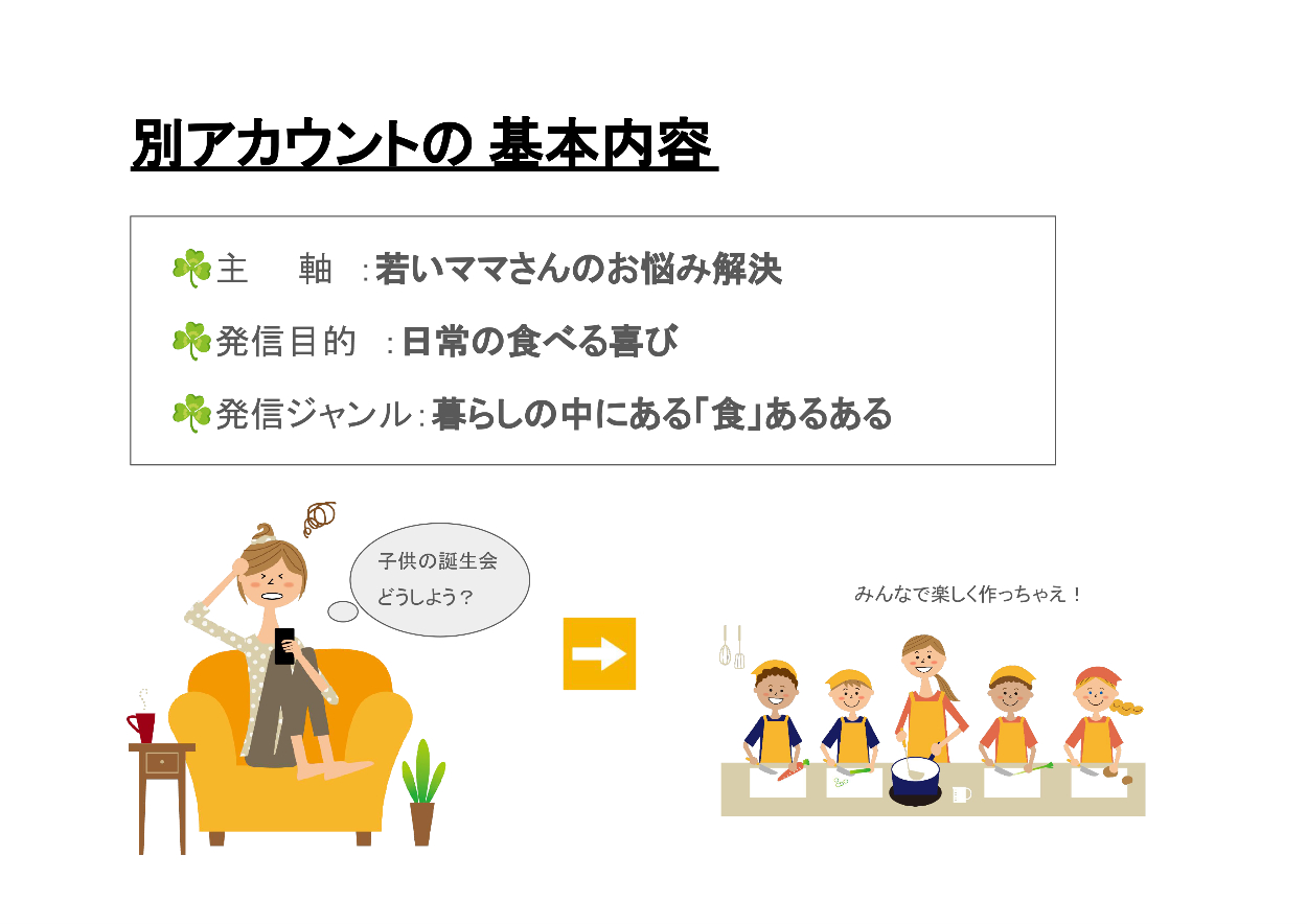 インスタグラムを運用中の顧客から相談を受け、提案したものです。 フォロワーの増加と共に、アカウントの乗っ取りや、アクションブロック、最悪にはアカウントの凍結さえも起こる可能性があるため、リスク回避のサブアカウントを作成し、新しい世代の顧客を増やす施策の一つとして提案させていただき