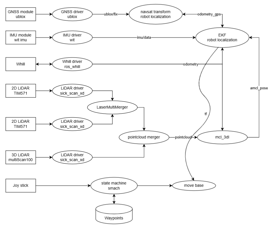 つくばチャレンジ2023 Nagayoshi Iemura 慶應義塾大学理工学研究科修士2年 以下のROSシステムにおいてMove baseという経路計画、追従、障害物回避を行うオープンソースパッケージを使用しており,実験的にパラメータ調整を行う役割を担当した。