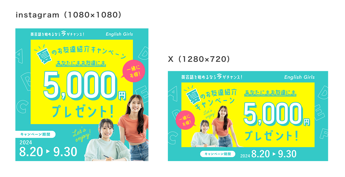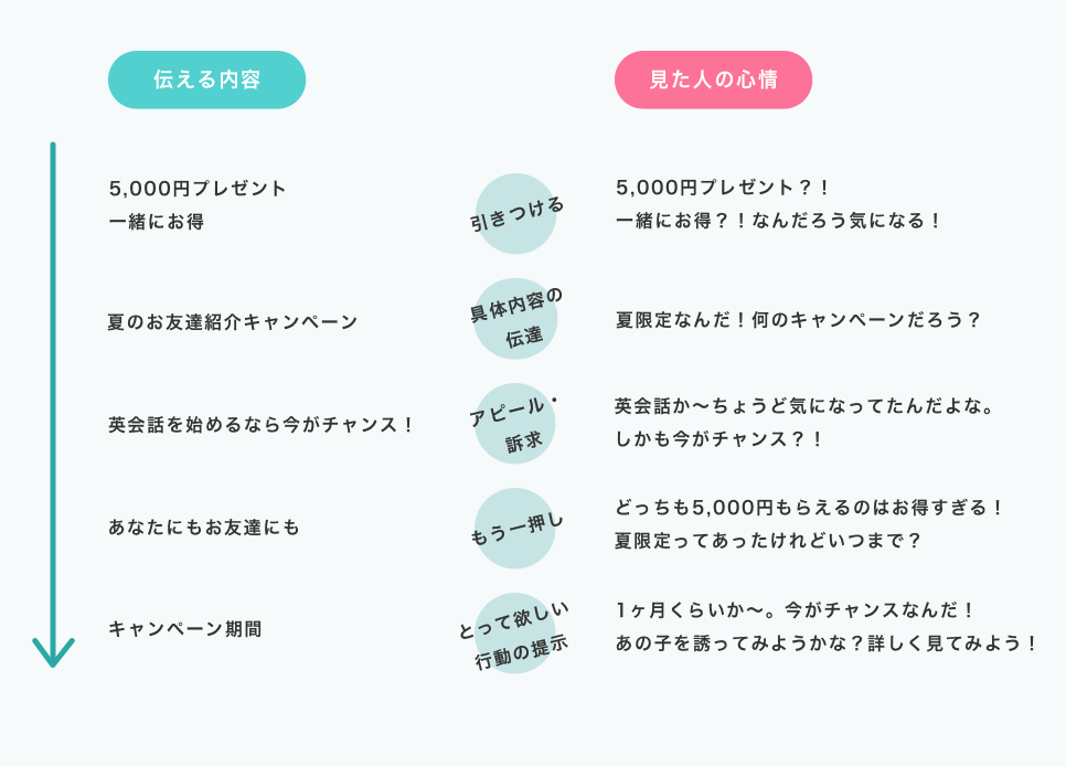 - まずは「5,000円プレゼント」で自分にとってお得なキャンペーンかもしれないという興味を持ってもらうことが大切だと考えました。そこから夏限定、英会話のスクールだと認識してもらうことで、「ちょうど気になってたんだよな」と今回ターゲットになる人に「自分ごと」としてさらに詳しく見てもらえるような流れを意識しました。