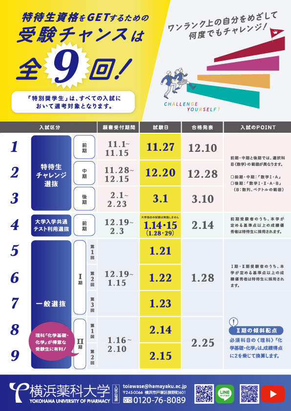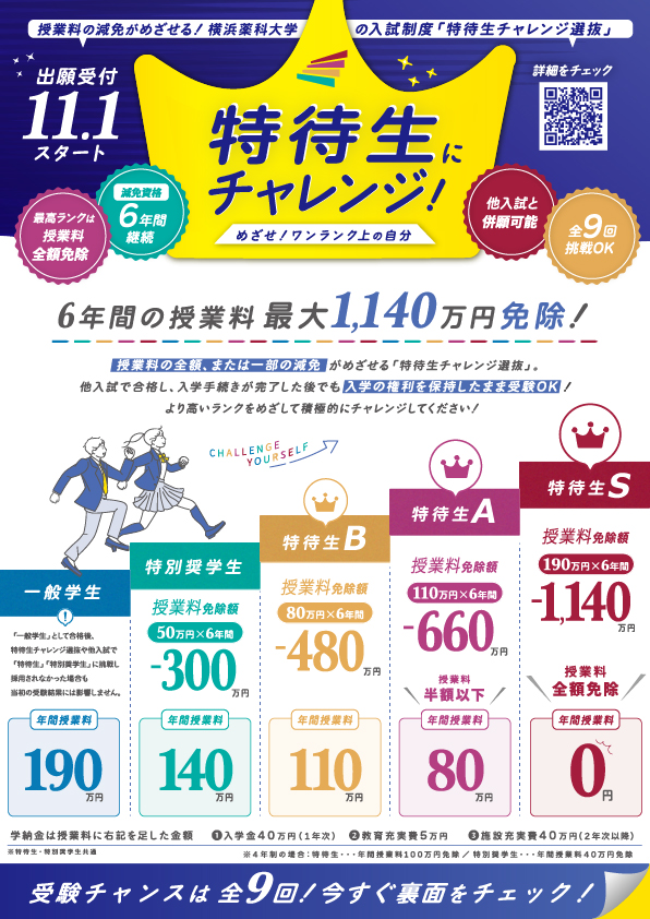 【チラシ】大学入試告知チラシ in'k デザインや書きものしてます OVERVIEW 特待生への挑戦促進 YEAR 2022 <ツール>チラシ両面(A4)<内容>大学入試の一つ「特待生チャレンジ」をPRするチラシ。入試の結果によって授業料が減免される内容を5つのステップで表現し、わかりやすく伝えられるよう心がけました。