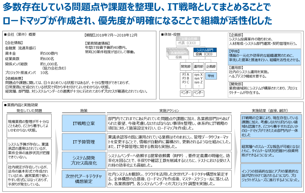 IT戦略の策定による組織活性化 じゅんCIO/CDO@DX王子 御社のCIO代行 / プロジェクトファシリテーター OVERVIEW 多数存在している問題点や課題を整理し、IT戦略としてまとめることで ロードマップが作成され、優先度が明確になることで組織が活性化した YEAR 2018