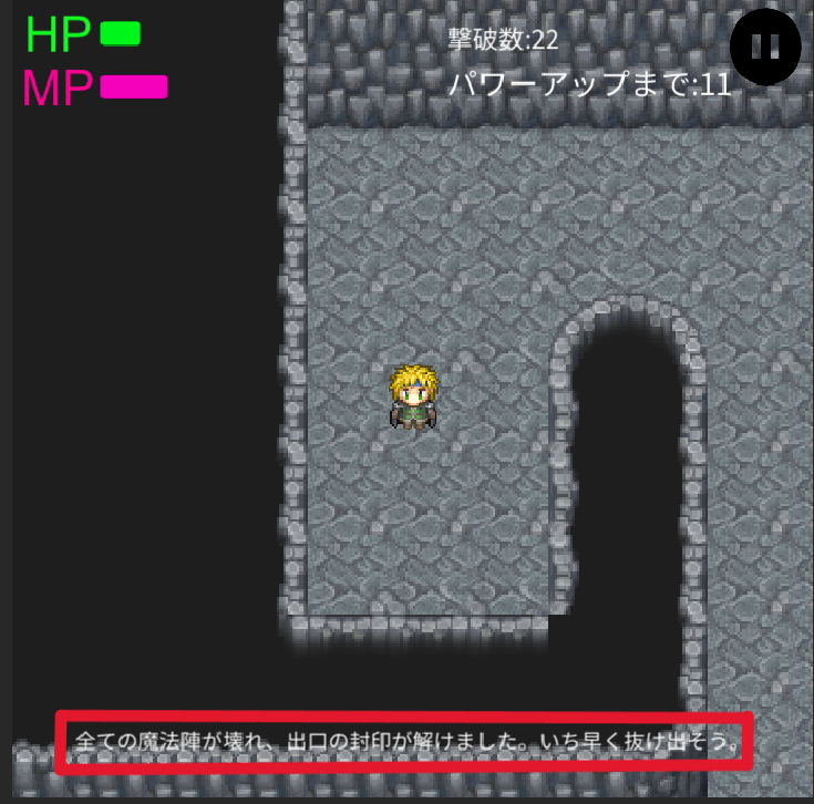 脱出するための出口にはオブジェクトがあり通れません。オブジェクトを消すには敵がスポーンする魔法陣をすべて踏む必要があります。これがクリア条件です。