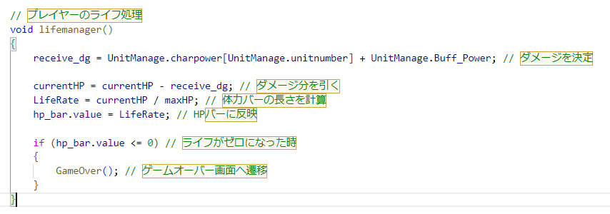例えば敵キャラクターにぶつかった時は、別のソースコード内(PlayerControll.cs)で敵キャラクターの攻撃力分HPを減らす処理をしていますが、その攻撃力の値はUnitManage.csの"charpower"変数を参照して計算しています。