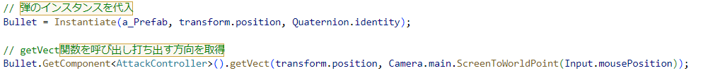 上のソースコードの1行目はBulletオブジェクト変数に弾のプレハブをインスタンス(生成)しています。