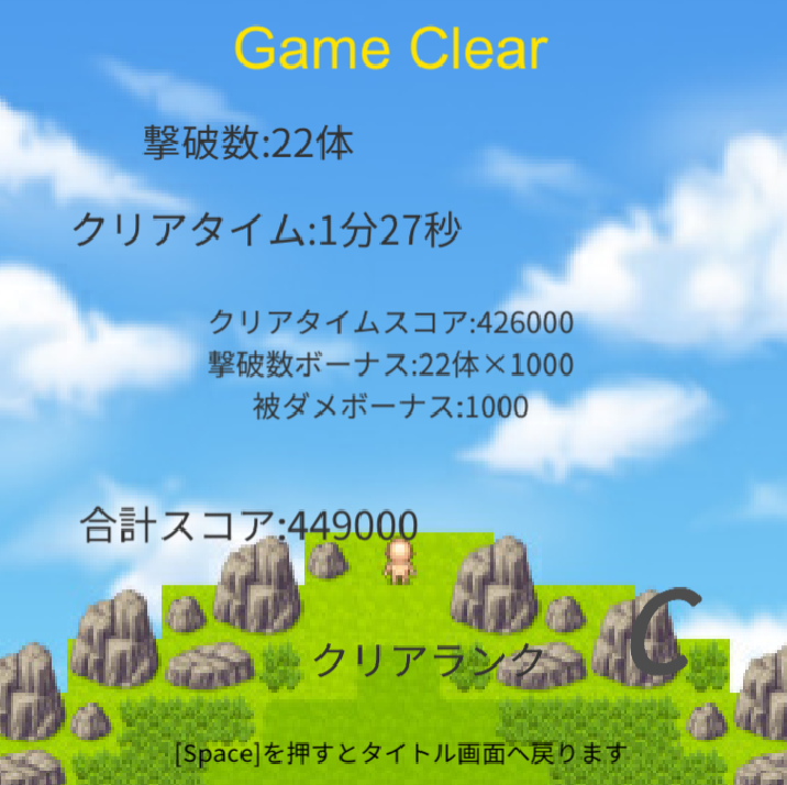 ゲームのクリア後、クリア画面に遷移するとスコアとそれに応じたランクが表記されます。ランクはS~Cまであります。さらにスコアの内訳も表記しているため、スコアを上げるための考察も必要になってきます。