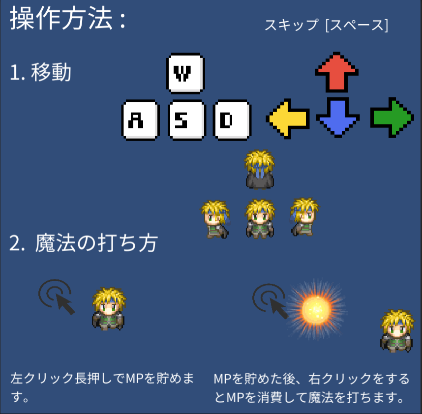 ユーザーが操作方法が分からず調べる手間をなくすために、プレイ前に表示しました。また、キーボードや矢印、マウスクリックのイラストを使用することでユーザーが一目で分かるようなデザインを心がけました。(素材元のサイトのURLは一番下に表記)