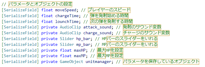 本ゲームには、設定値(敵のパワーアップまでの時間(20秒), パワーアップ量, 敵キャラクターのパラメータ等)が存在します。その設定は少しずつ値を変えながら細かく調整していく必要があります。なのでそういった値は、変数宣言の前に"[SerializeField]"を記述することで、ソースコードを開いて代入処理をするのではなくエディター上で調整できるようにしました。